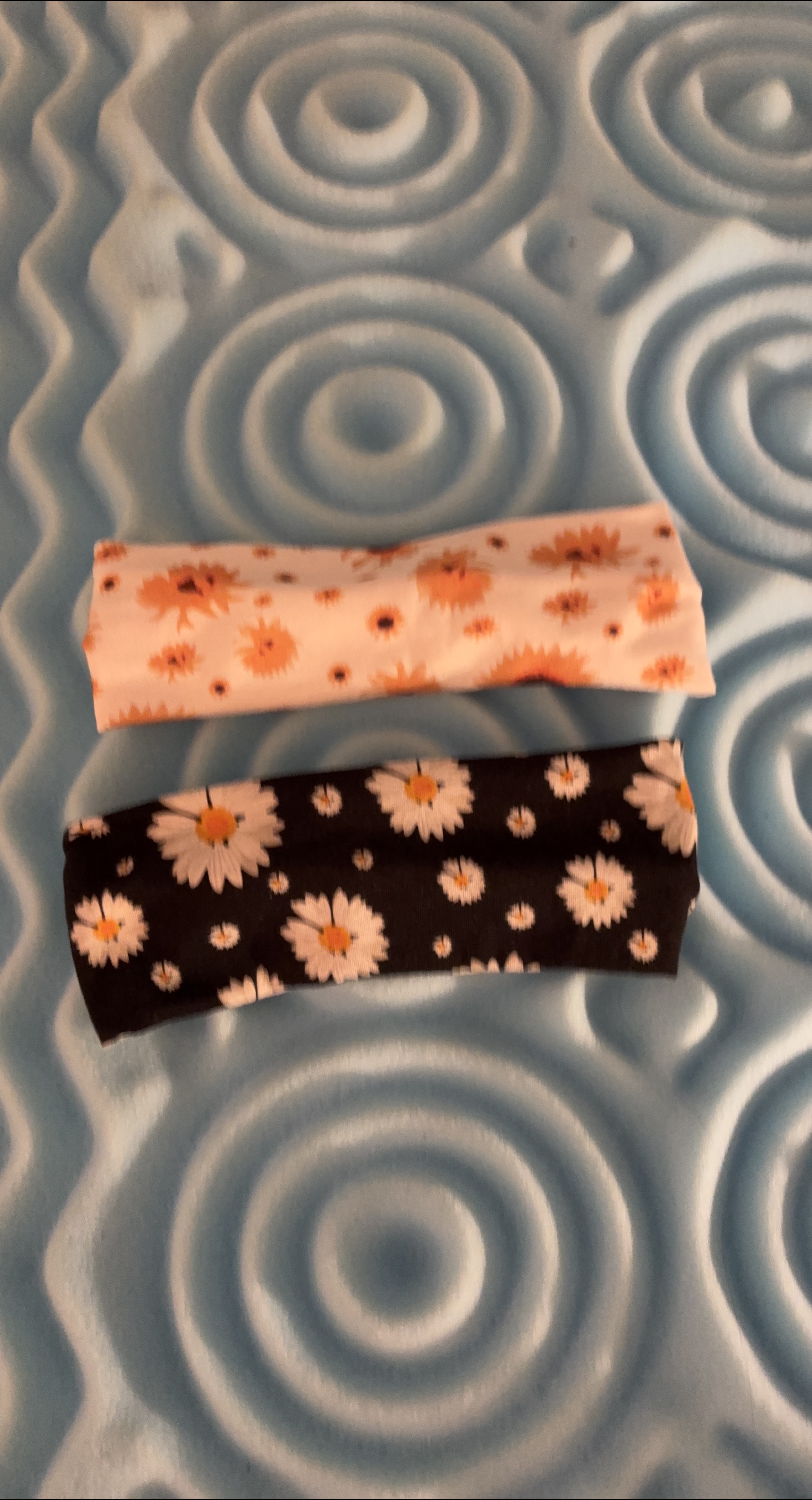 Here's a set of two cute headbands with daisy prints! One is black with white daisies and the other is a light peach colour with orange daisies. Perfect for keeping your hair back in style