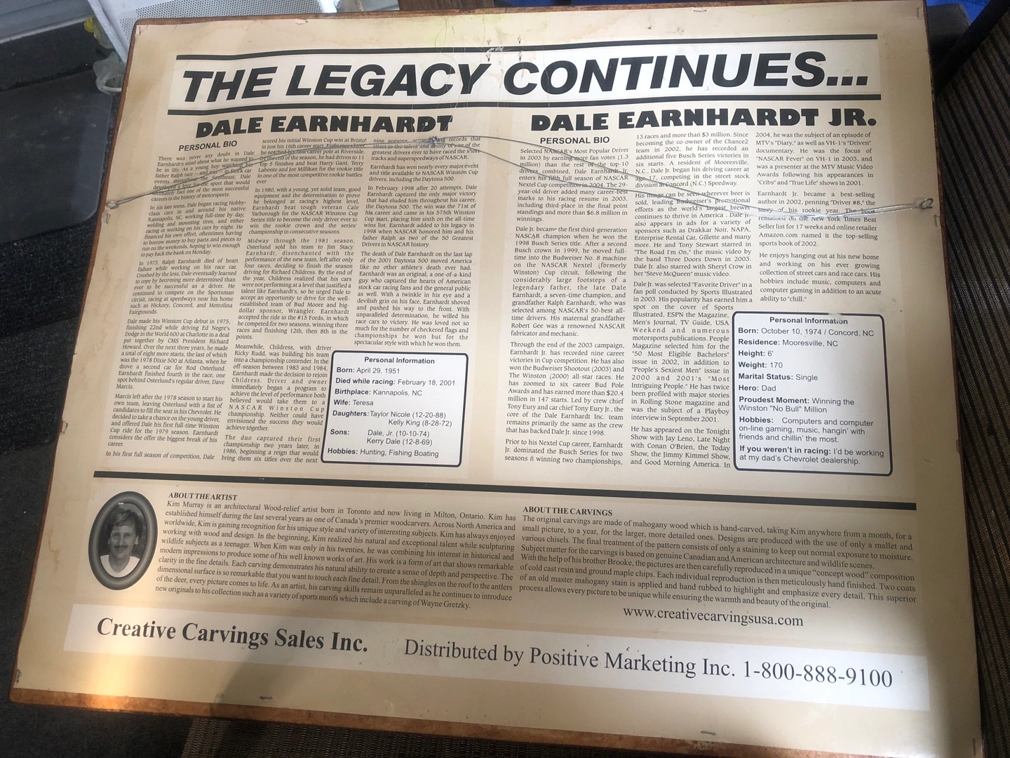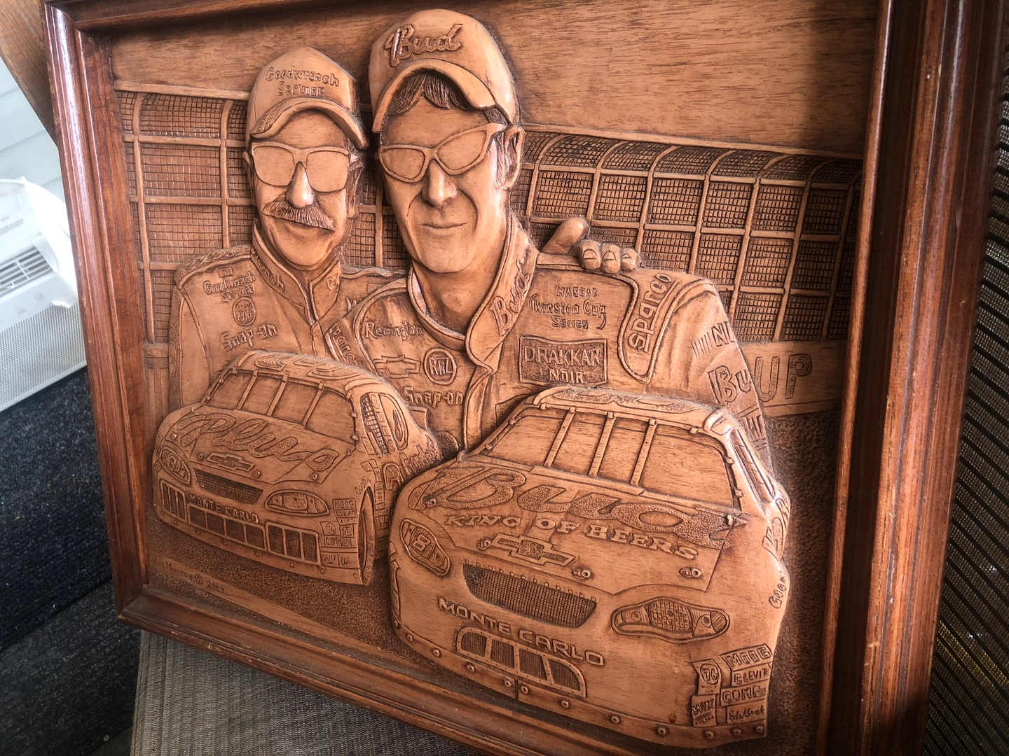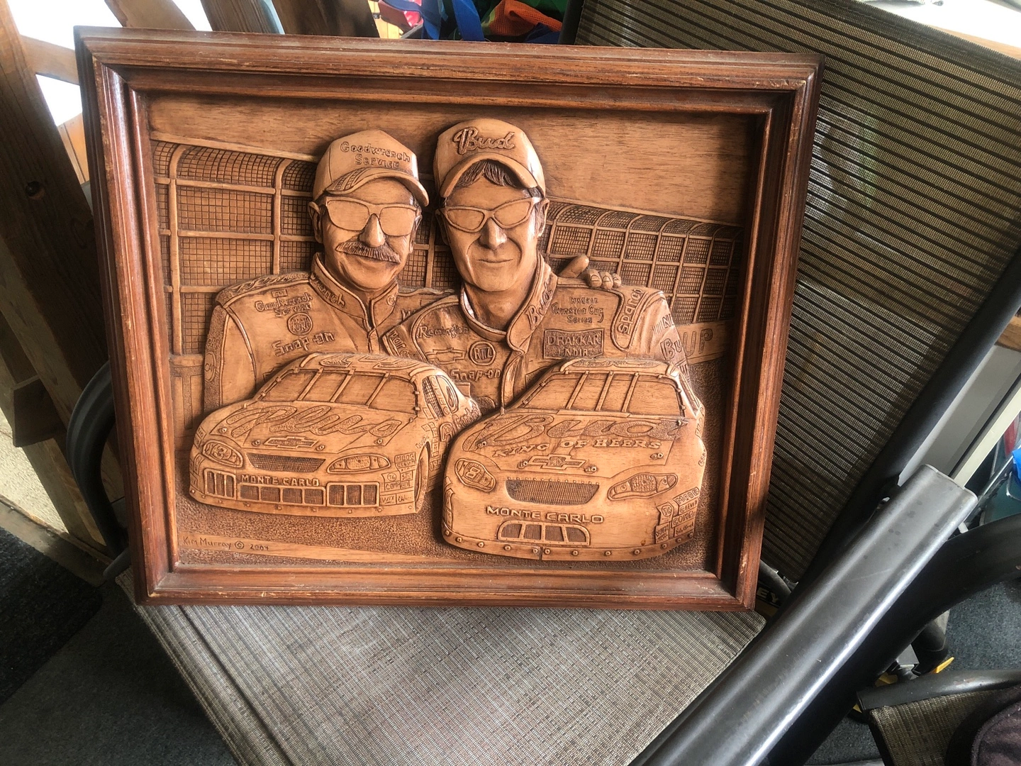 Check out this unique piece of wall art! It features a detailed wood carving of Dale Earnhardt with his race cars. It's a really cool piece for any racing fan or collector looking to add some character to their space