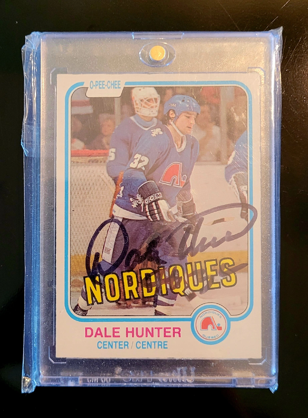 Selling a Dale Hunter Nordiques O-Pee-Chee hockey Rookie card! It features Dale Hunter as Center for the Nordiques team. Dale will be coaching the world juniors again this year. This card is a great addition for any hockey fan or collector. The auto was received in person at his local watering hole in London.