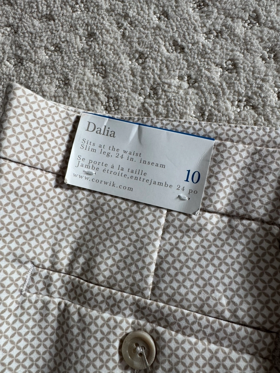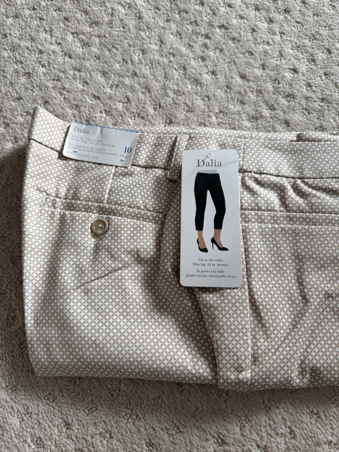 Cream coloured pants with a geometric pattern. Size 10. Slim leg, 24 inch inseam. Sits at the waist. New with tags.