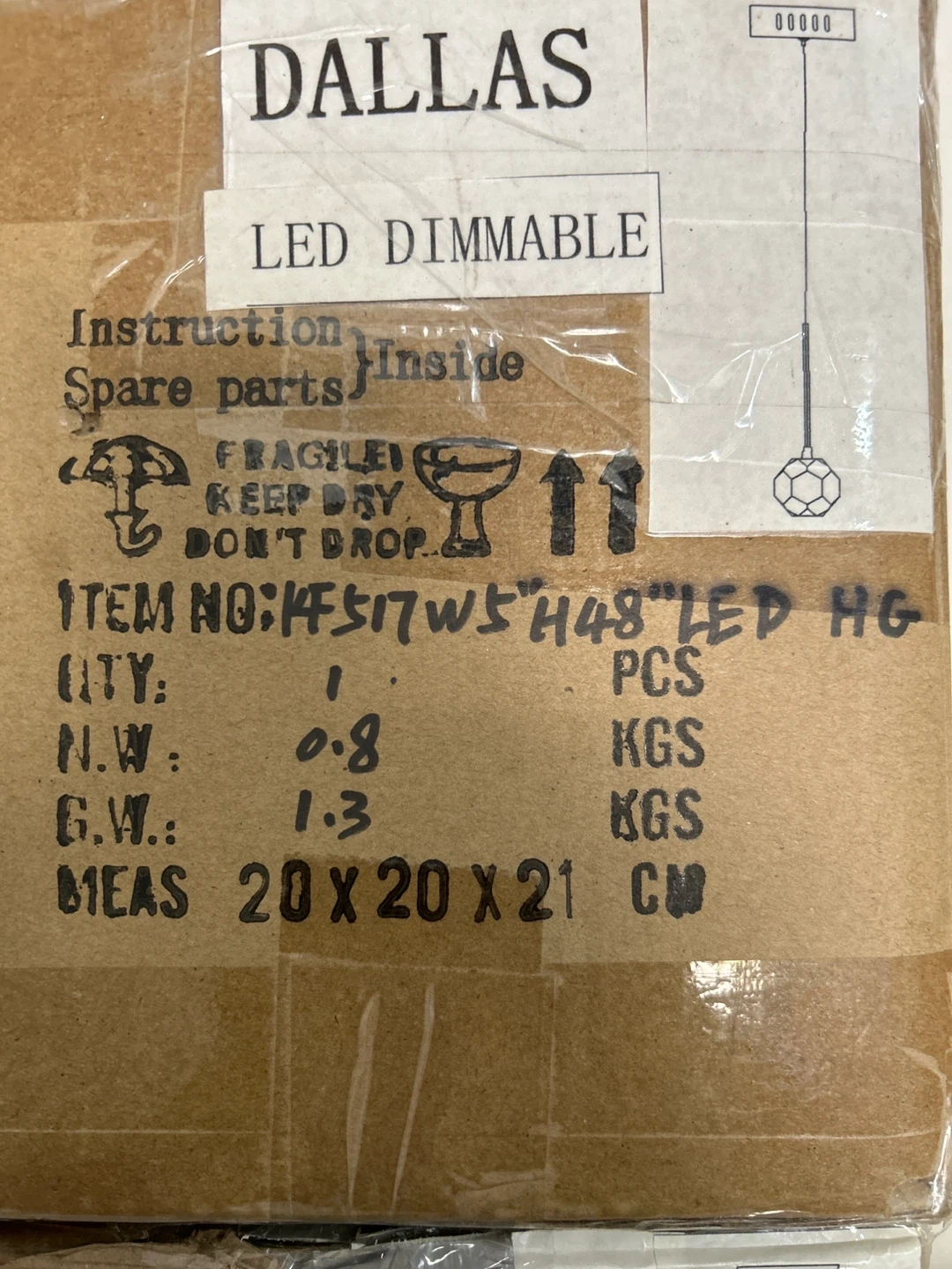 Selling a brand new Dallas LED dimmable pendant light, still in its original packaging! The box includes instructions and spare parts. Item No: KF517W5" H48"LED HG Measurements: 20 x 20 x 21 cm Net Weight: 0.8 KGS Gross Weight: 1.3 KGS