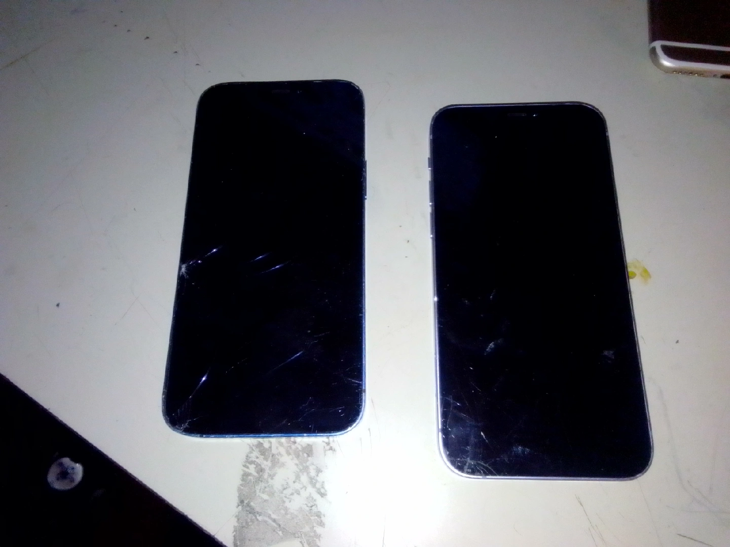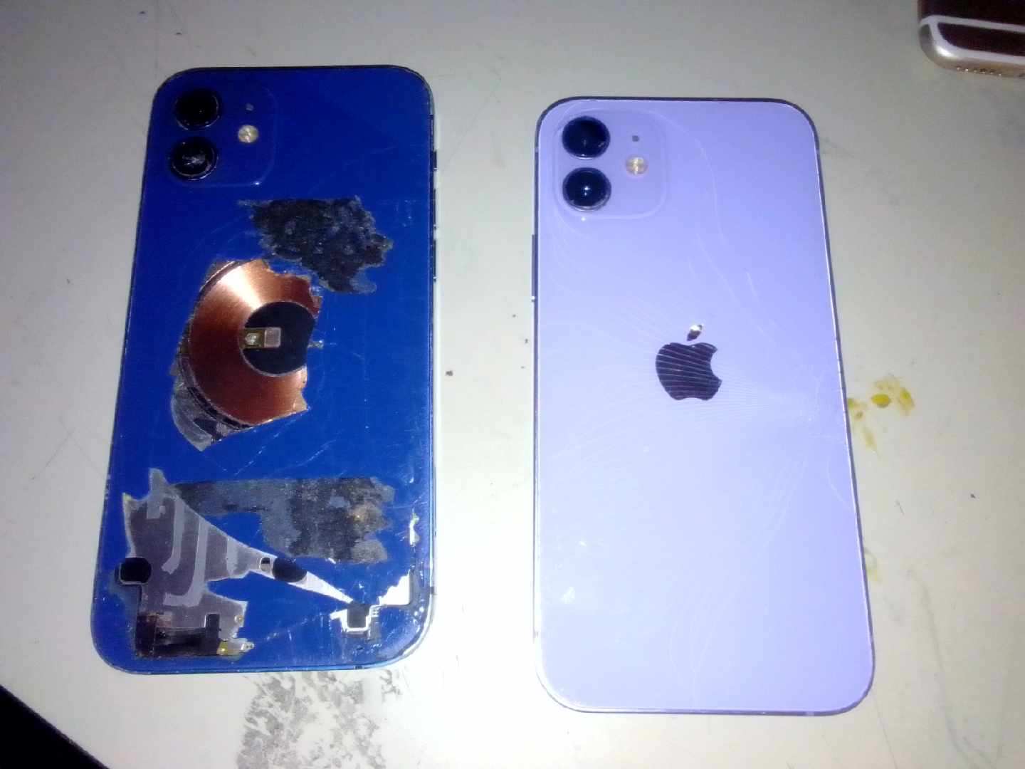 Selling two iPhones that are damaged and suitable for parts. One is blue with significant damage to the back, exposing internal components. The other is a light purple colour with a cracked screen and back. Both screens are also cracked. Good for repair or parts! $80 for both