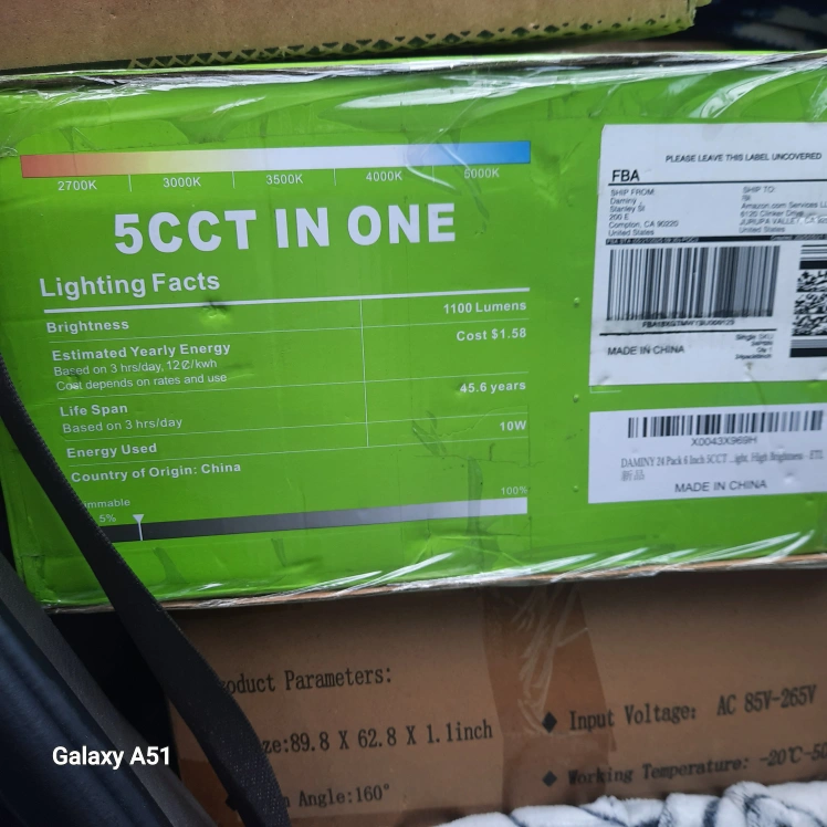 Selling a DAMINY 24 Pack of 6 Inch 5CCT lights. These lights have a brightness of 1100 Lumens and an estimated yearly energy cost of $1.58. They have a lifespan of 45.6 years based on 3 hours of use per day. The product parameters are: 89.8 x 62.8 x 1.1 inch with an angle of 160°. The input voltage is AC 85V-265V and the working temperature is -20℃-50℃