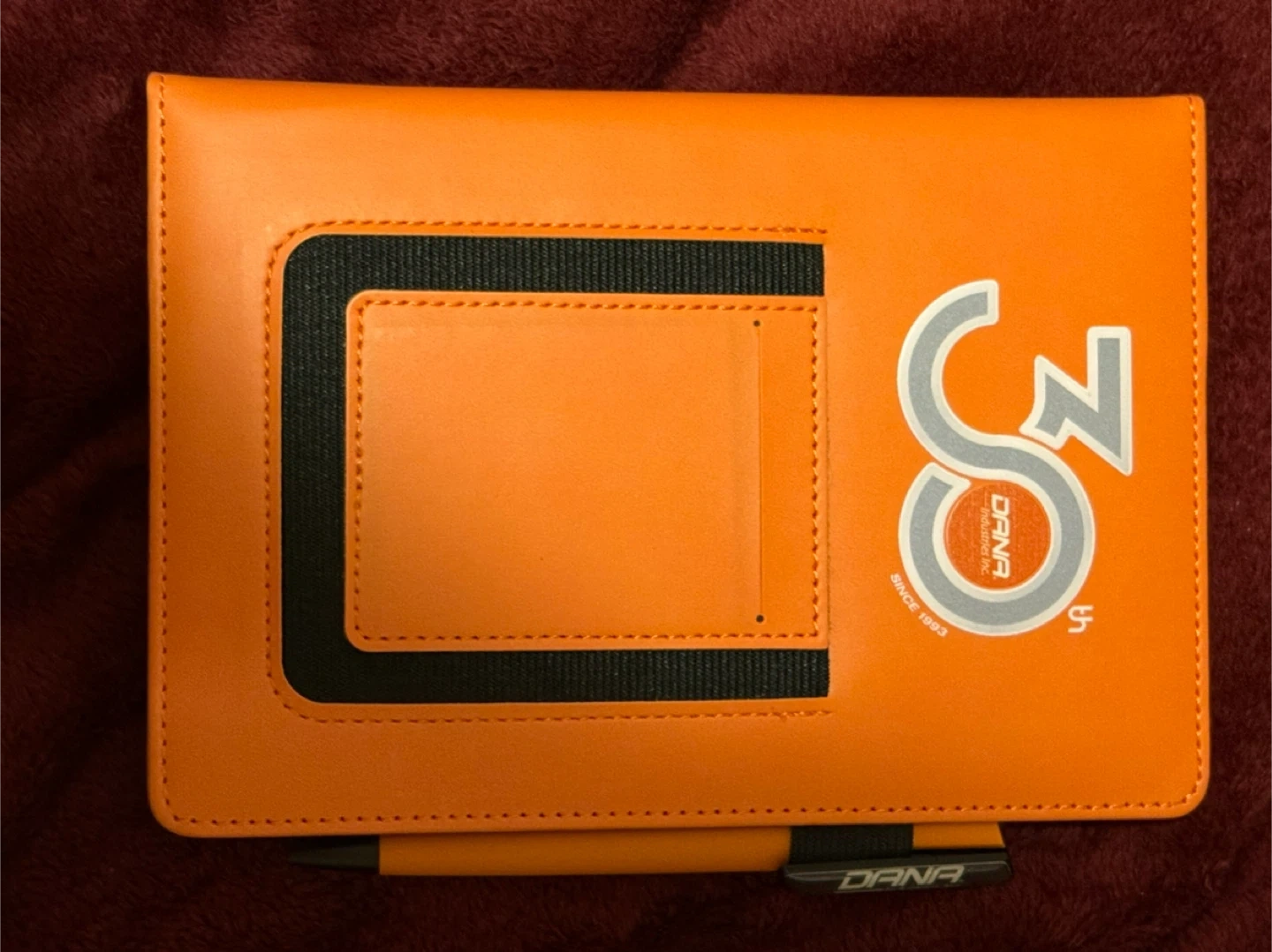 Here's a DANA Industries padfolio in orange. It includes a pen. The padfolio has a sleek design and is perfect for meetings or taking notes on the go!