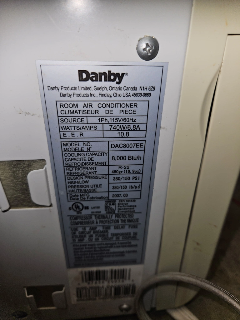 Selling a Danby room air conditioner, model DAC8007EE. It's a bit dusty but still works. Specs include: - 1Ph, 115V/60Hz - 740W/6.8A - E.E.R 10.8 - Cooling capacity of 8,000 Btu/h - Refrigerant R-22 - Date MFG 2007 March