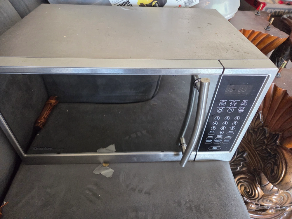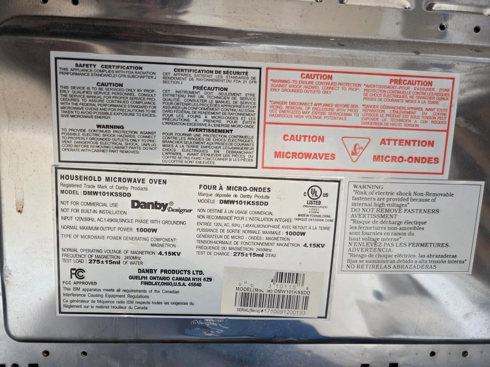 Selling a Danby Designer microwave, model DMW101KSSDD. It's a household microwave oven and requires a 120V/60Hz AC, 1.45KW/Monophase outlet. It has a maximum output power of 1000W and a normal operating voltage of 2450MHz.