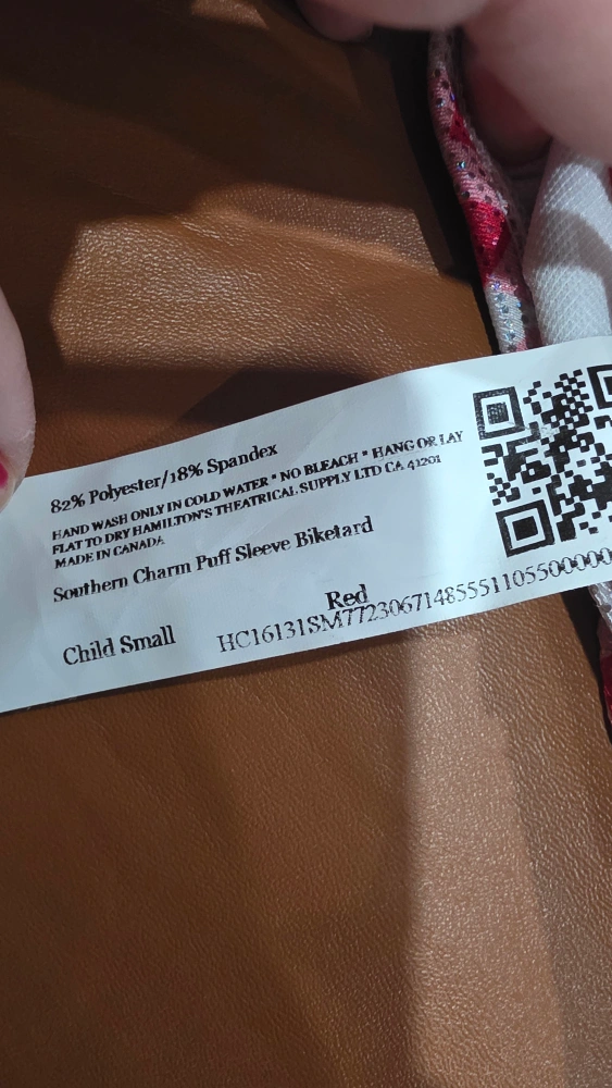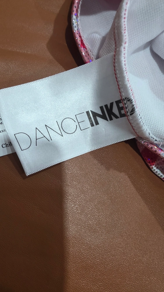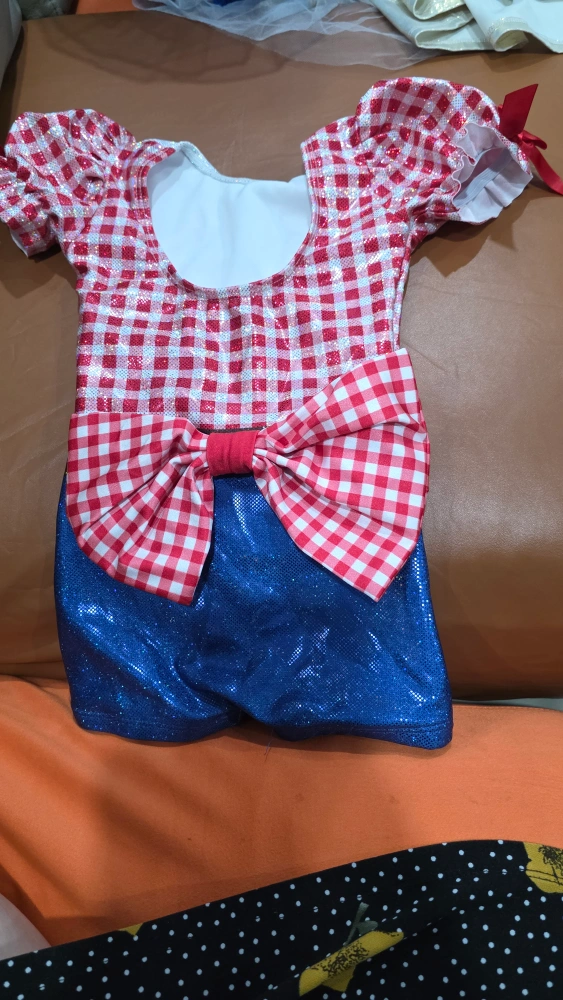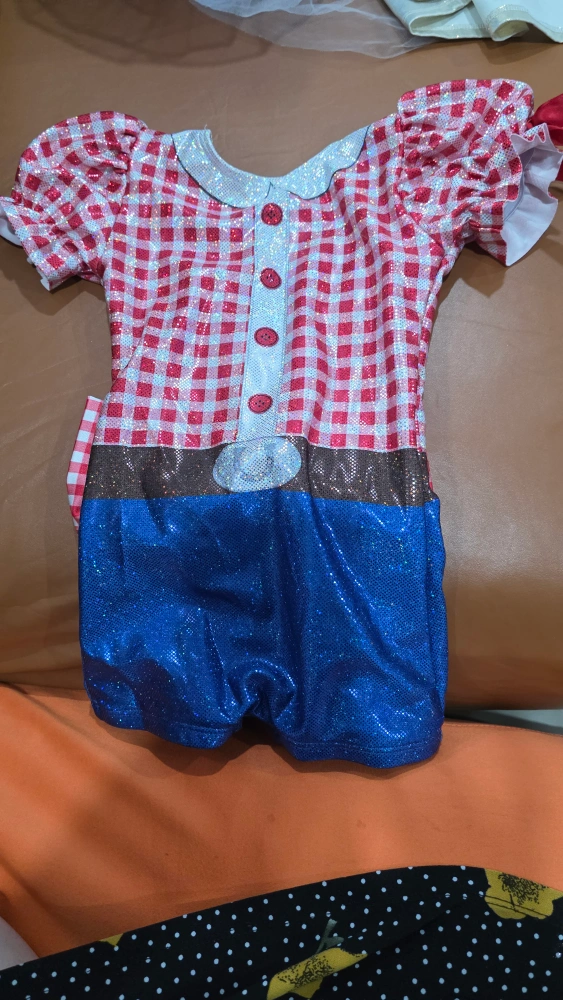 Selling a DanceInker Southern Charm Puff Sleeve Biketard. It's a child's size small and features a red and blue design. The material is 82% polyester and 18% spandex. Perfect for dance or costume!