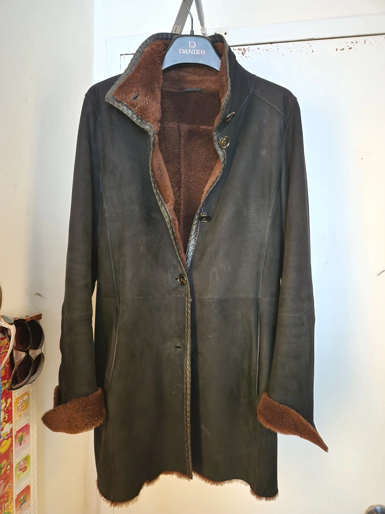 Here's a stylish black leather coat from Danier. It's perfect for adding a touch of sophistication to any outfit. The coat is made of high-quality leather and is in great condition!