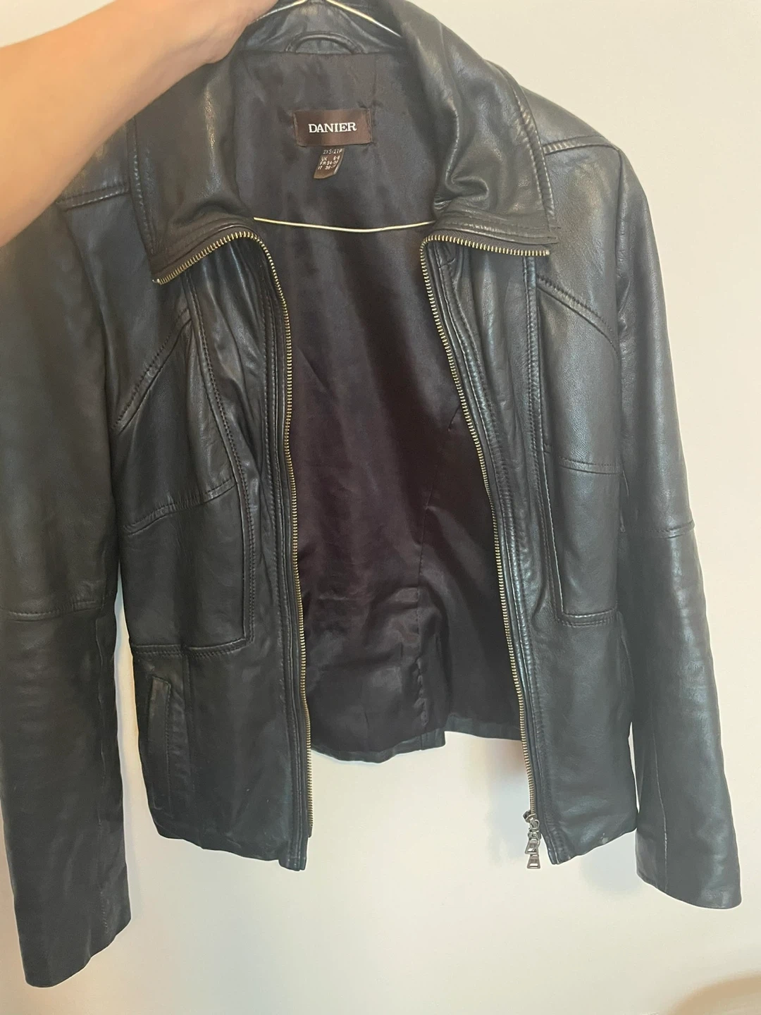 Selling a DANIER black leather jacket in size small. It's in great condition and ready for a new home! Perfect for adding a touch of style to any outfit. The jacket is made of leather, ensuring durability and a classic look