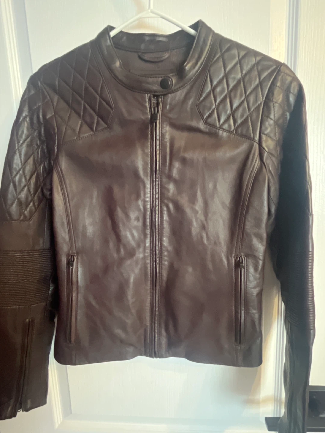 Selling a stylish Danier leather jacket in a lovely burgundy colour. It's a size 2XS. The jacket features a quilted design on the shoulders and ribbed detailing on the sleeves. Pet and smoke free home. Pick up in Stittsville.