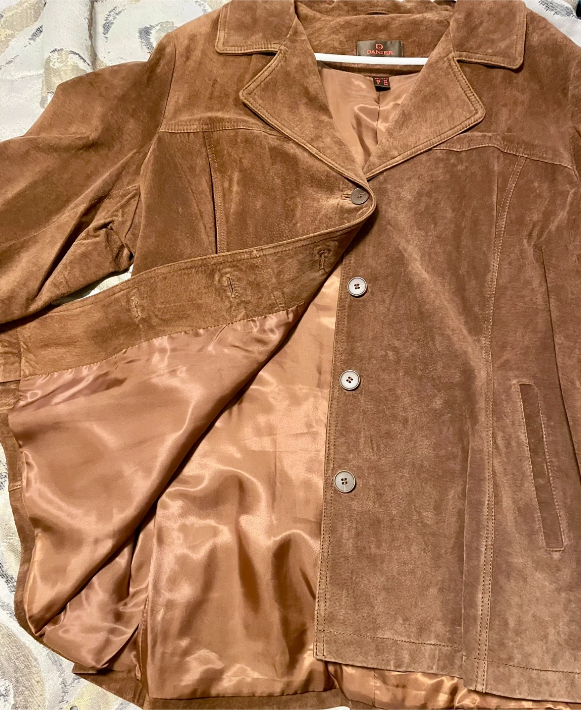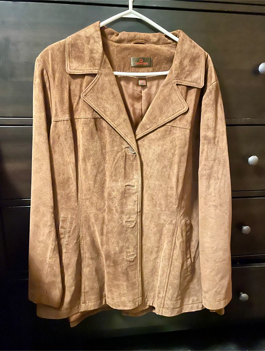 Here's a stylish brown suede jacket from Danier! It's a size 3XL, perfect for layering or wearing on its own. The jacket has a classic design with a button-up front and a comfortable fit. Bought 5 years ago, was only worn twice. Beautiful Jacket. Suede is soft! Paid 350.00 asking 200.00.