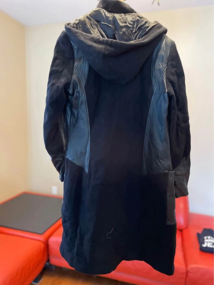 Black coat with Italian Leather sleeves. Medium, woman’s. Plus, cute matching hat. Pick-up in Oakville, just off Bronte.