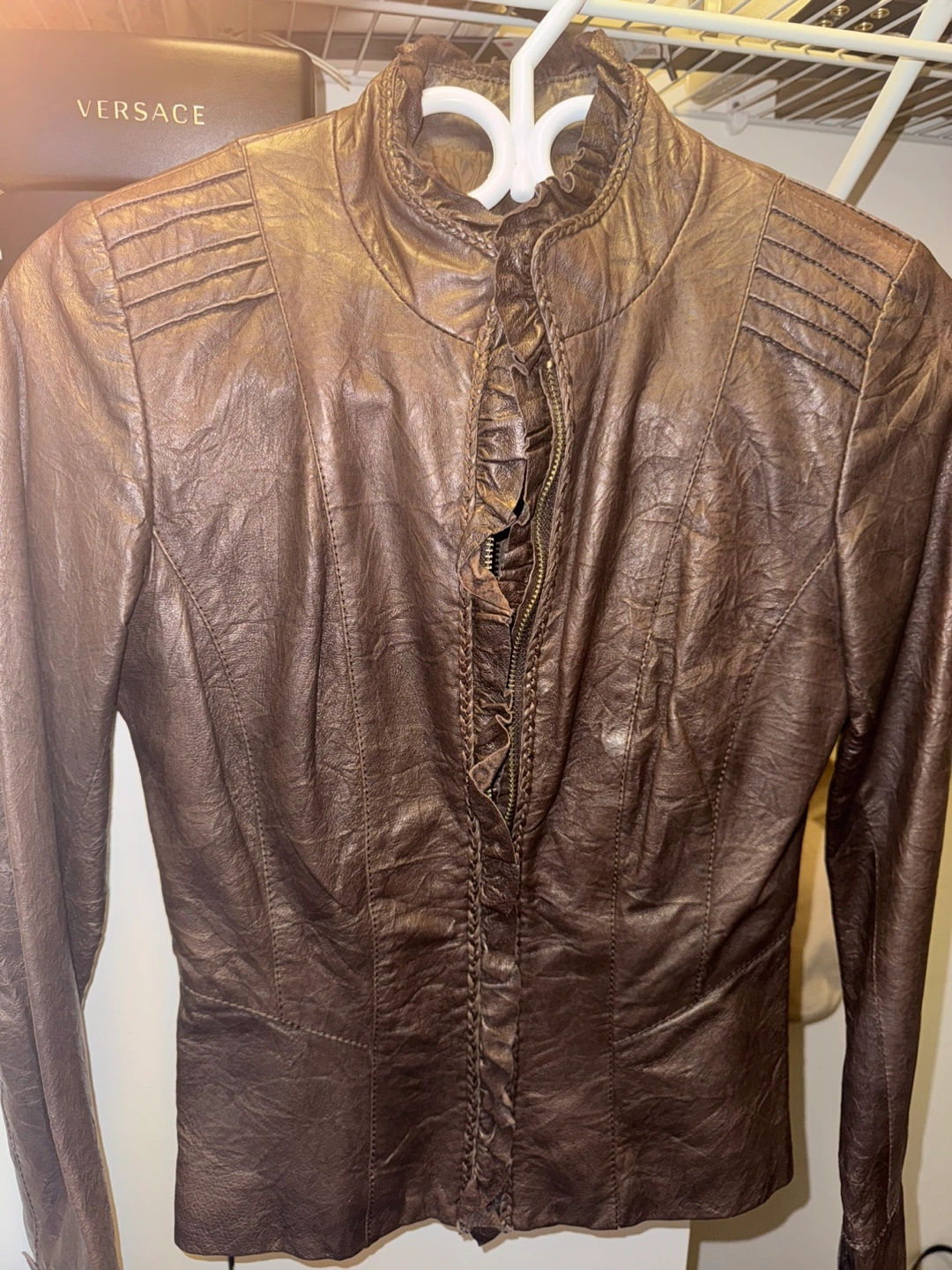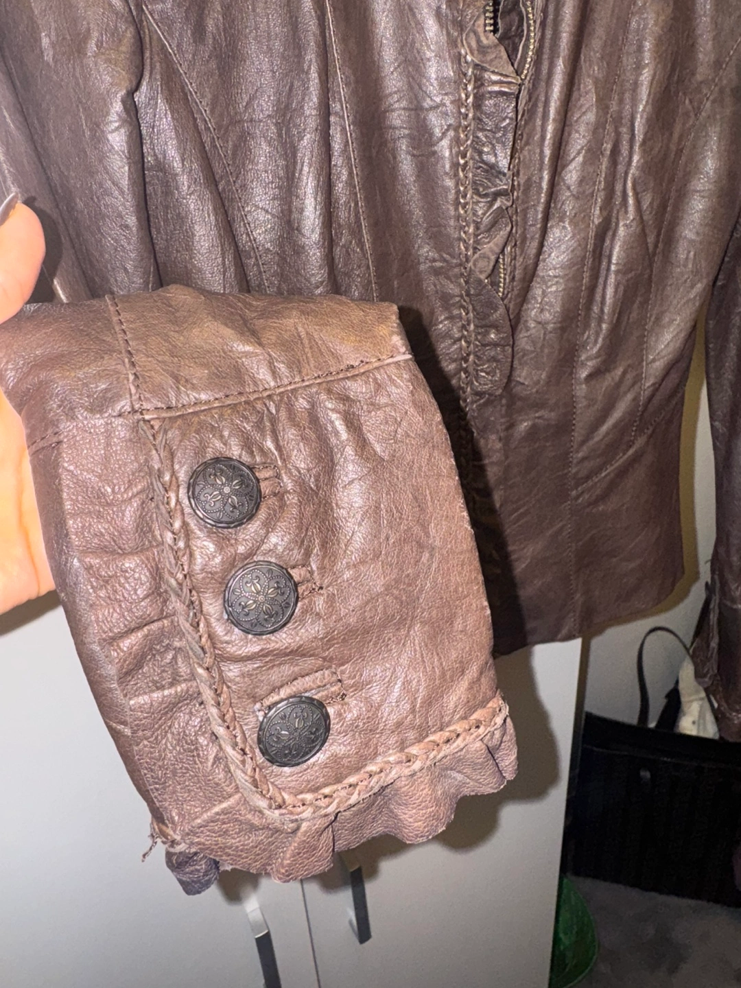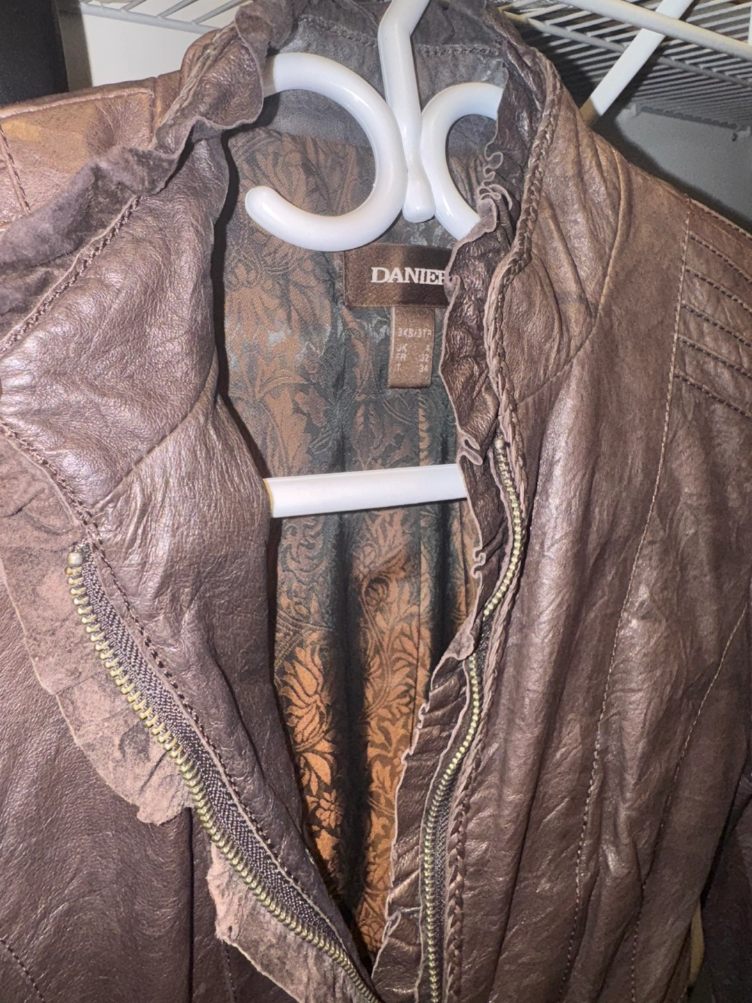 Selling a Danier leather jacket in size XXS It's a stylish piece with unique detailing. The jacket is made of leather and features a ruffled design around the zipper and decorative buttons on the sleeves. Perfect for adding a touch of edge to your wardrobe! Perfect for fall