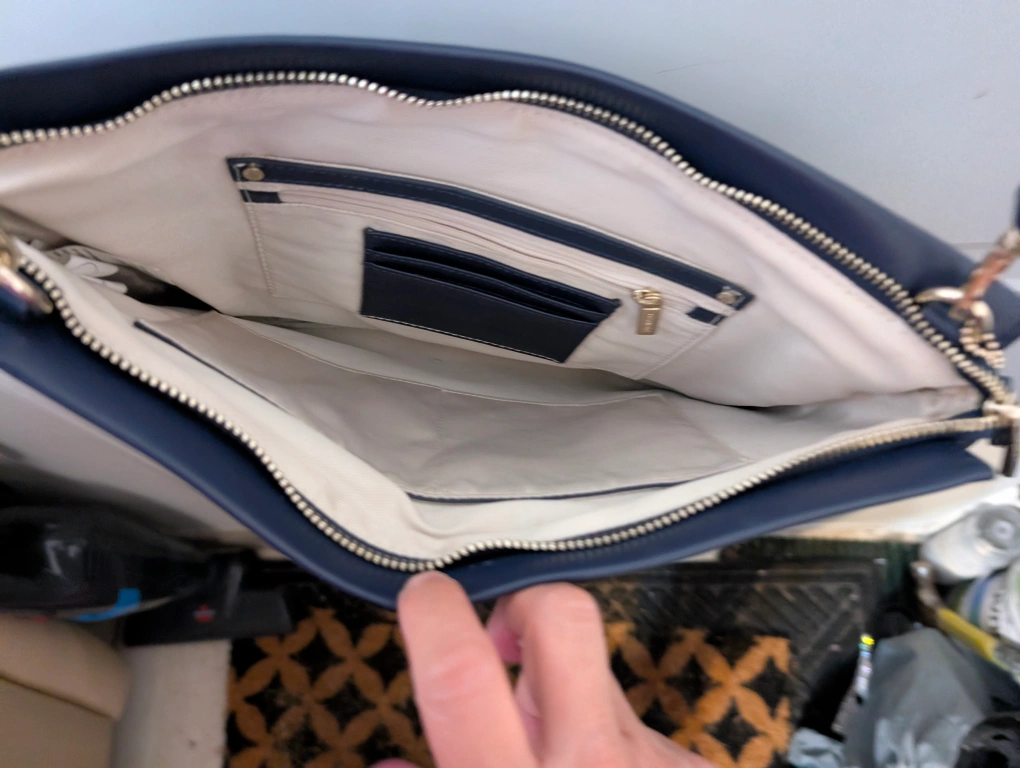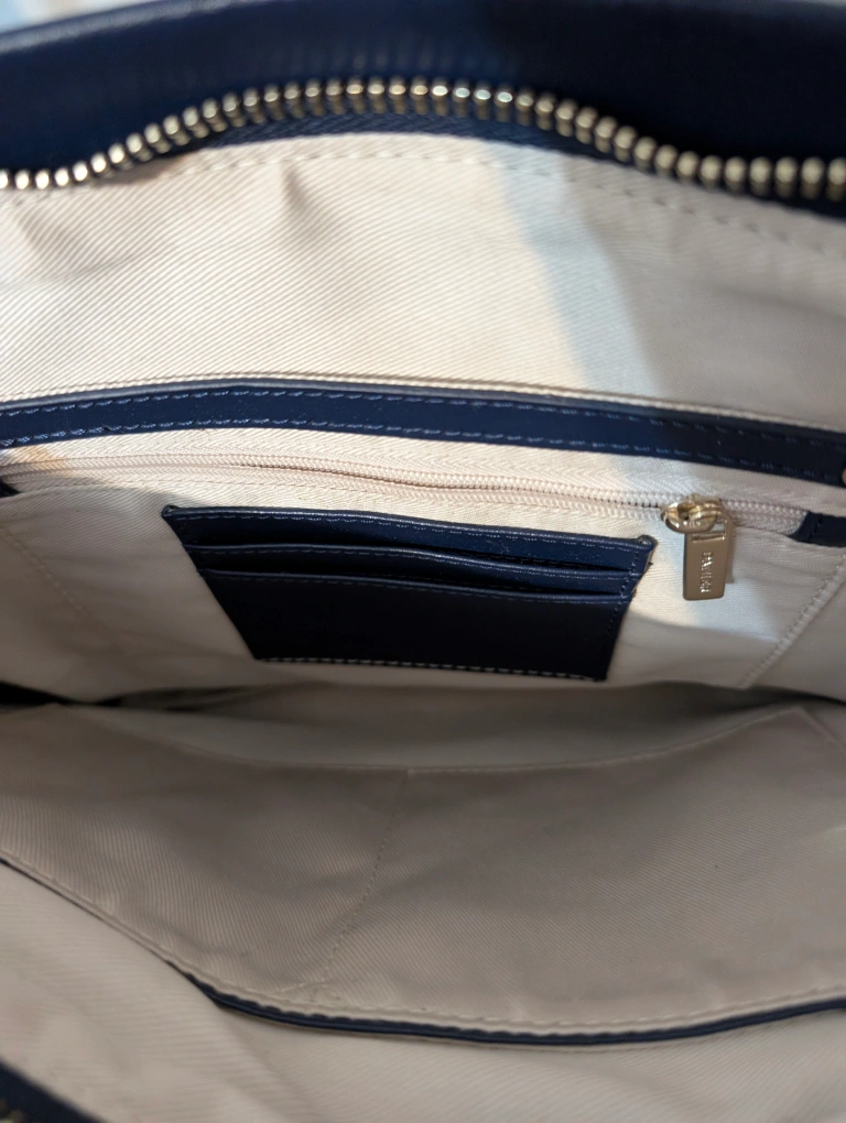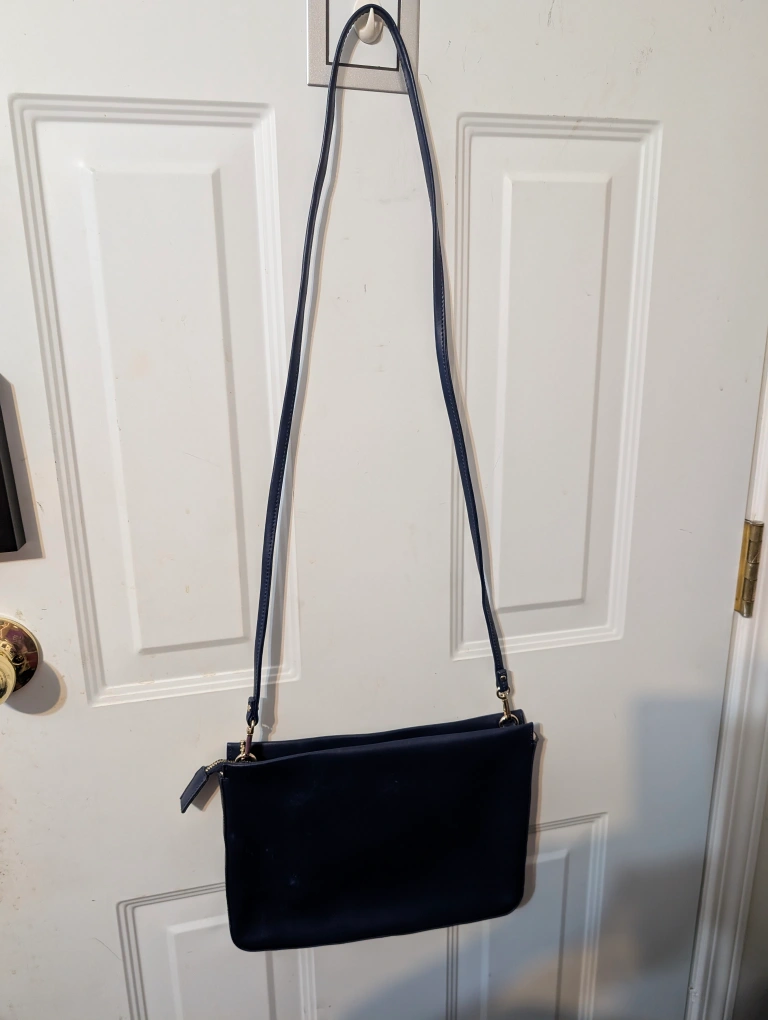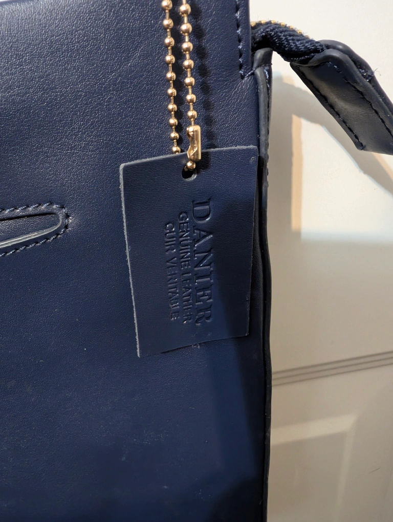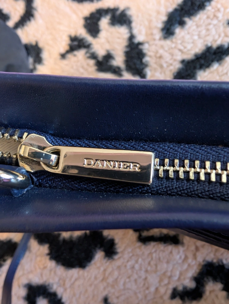 This is a Danier crossbody bag in navy blue leather. It's in good condition and has a zipper closure. The bag measures approximately 12 1/2" in width and 9 1/4" in length. Perfect for everyday use!