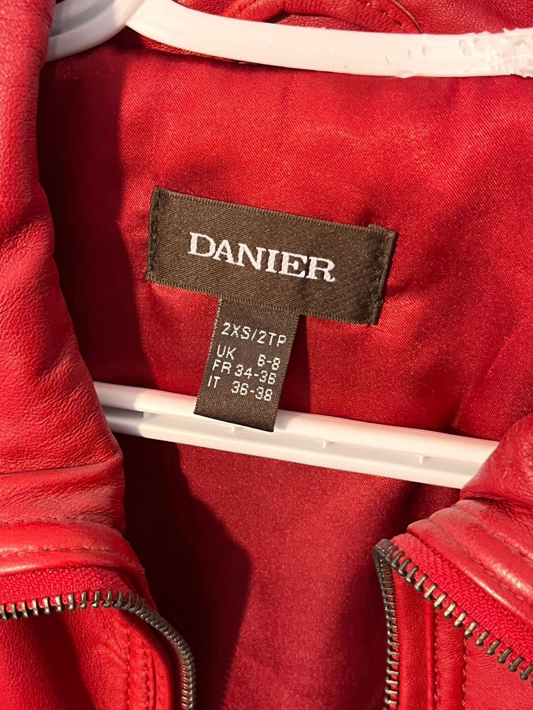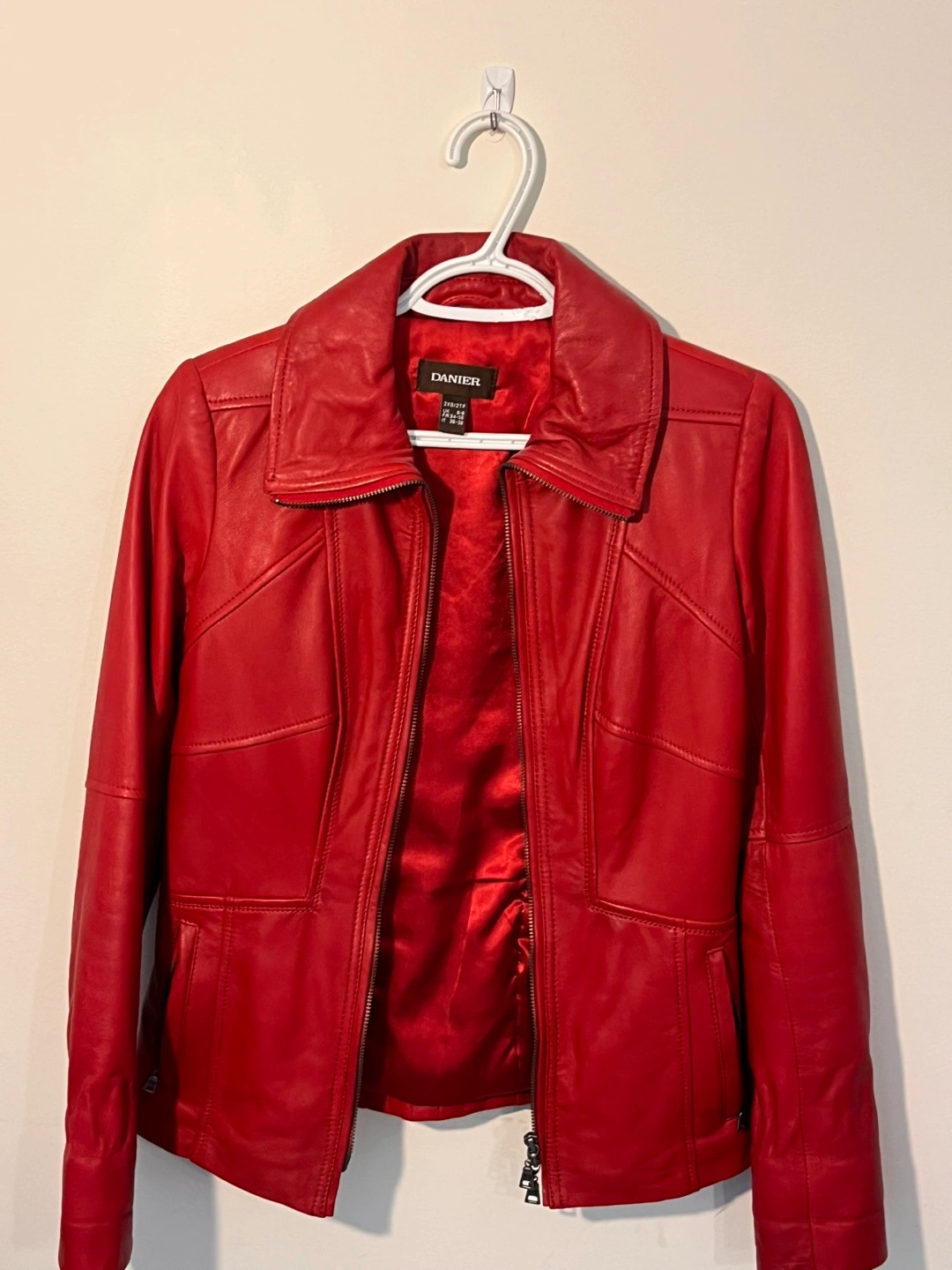 Check out this stylish Danier red leather jacket! It's a size 2XS. Perfect for adding a pop of colour to your wardrobe
