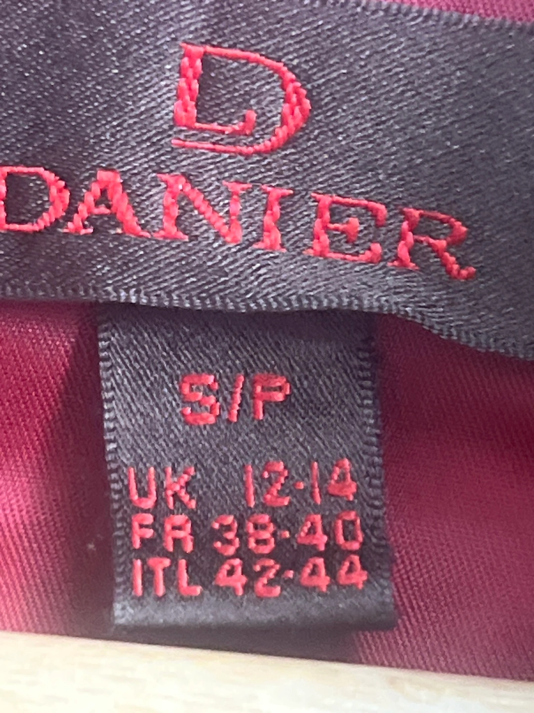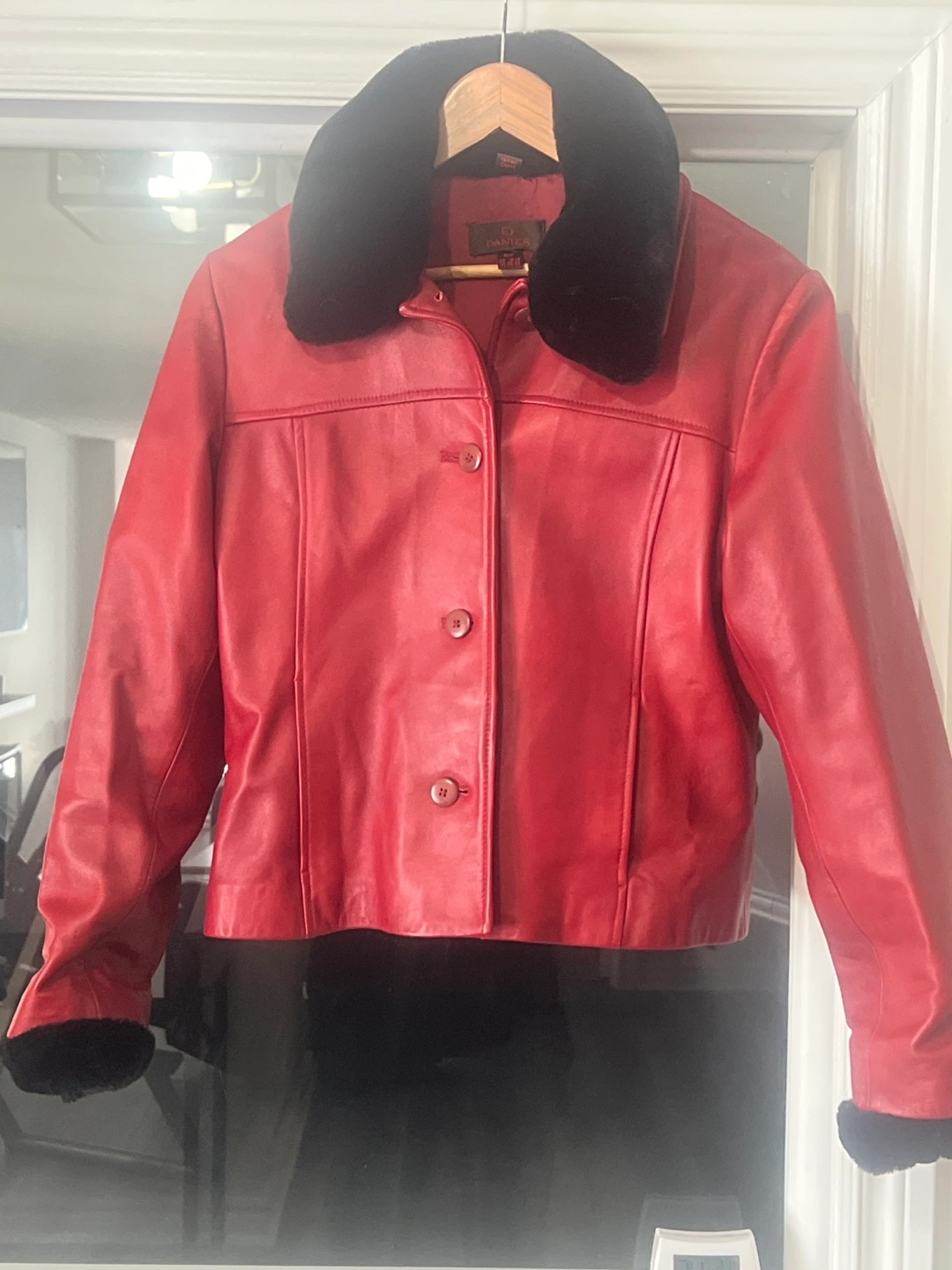 Red leather jacket with black fur collar and cuffs. Size S/P. UK 12-14, FR 38-40, ITL 42-44. Removable liner sleeves and inside that’s also the collar and sleeve cuffs Barley worn Like new condition