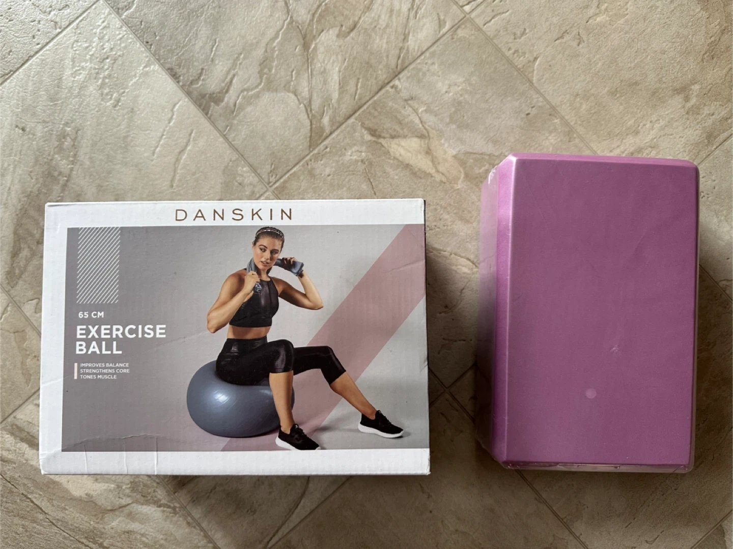 Get ready to evolve your fitness routine with this Danskin exercise ball and yoga block! The exercise ball is 65cm and helps improve balance and strengthen core muscles. Pump included with the exercise ball! The yoga block is still sealed in plastic Both are in unused new condition