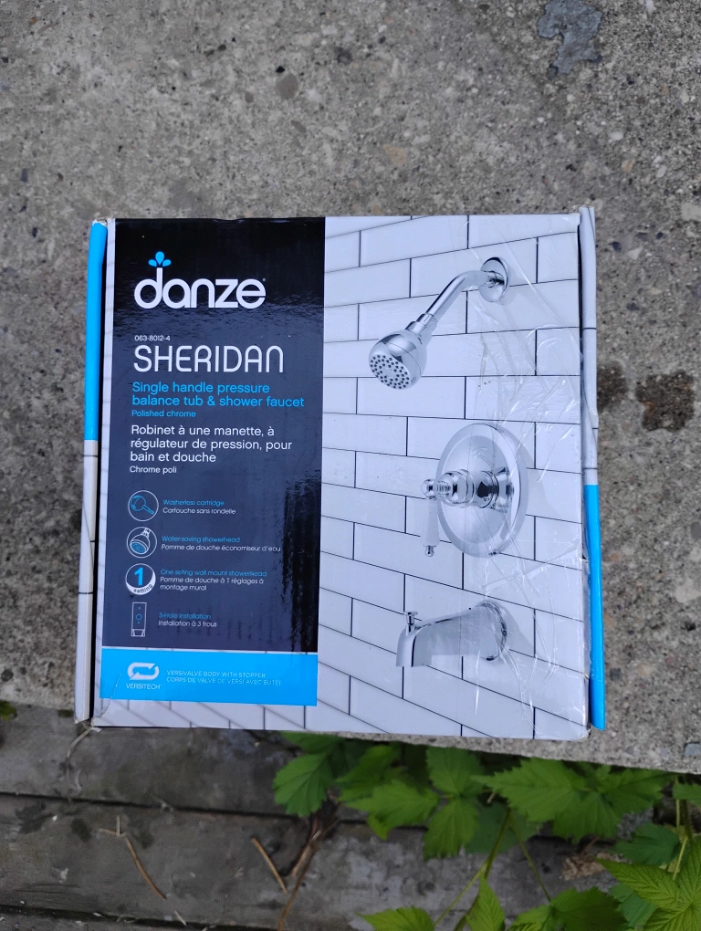 Selling a brand new Danze Sheridan single handle pressure balance tub and shower faucet. It's in polished chrome and comes in the original box. Features a washerless cartridge and a water-saving showerhead. Perfect for a new bathroom or renovation project!