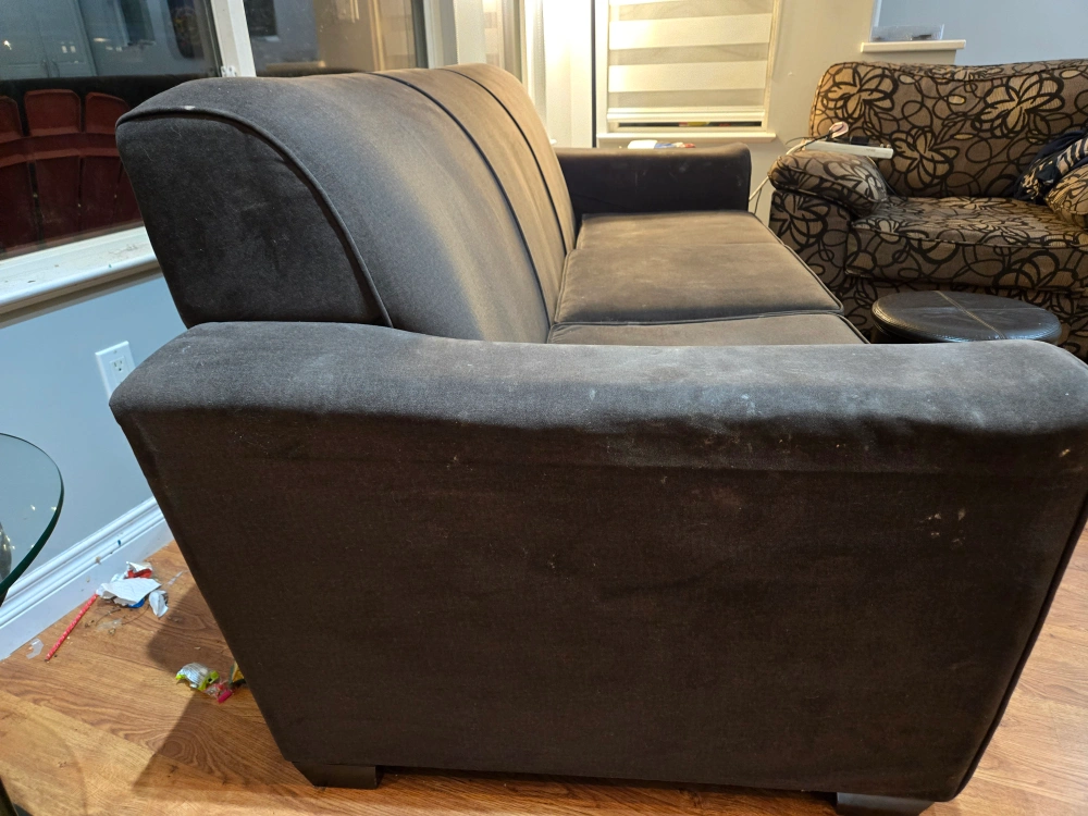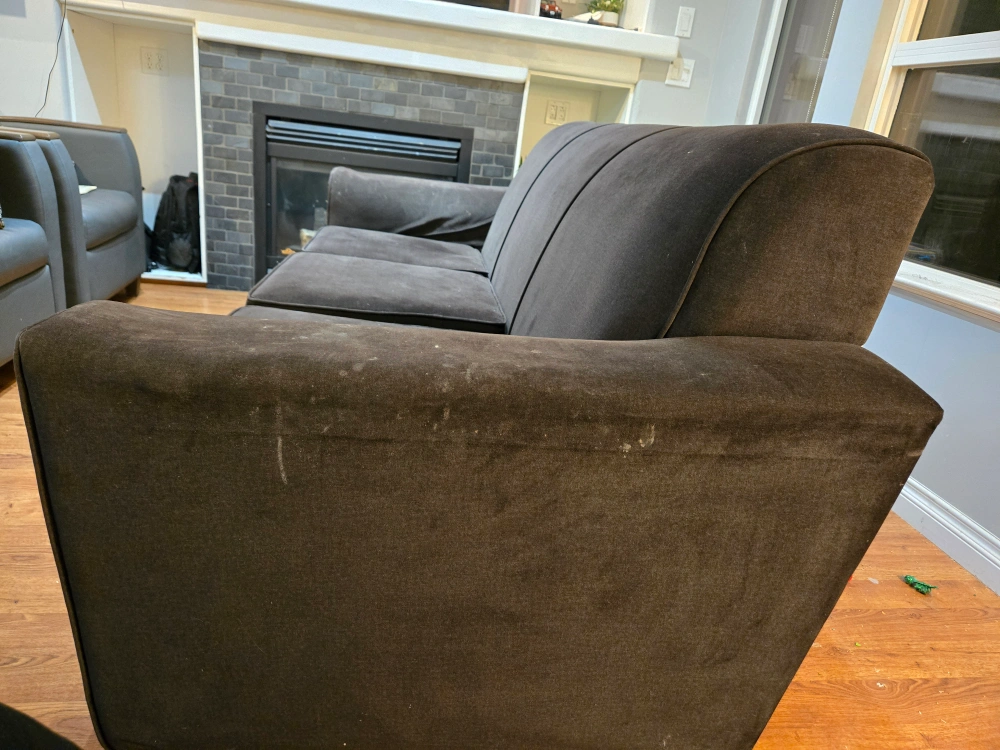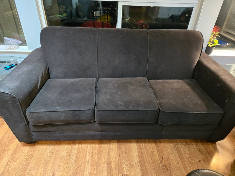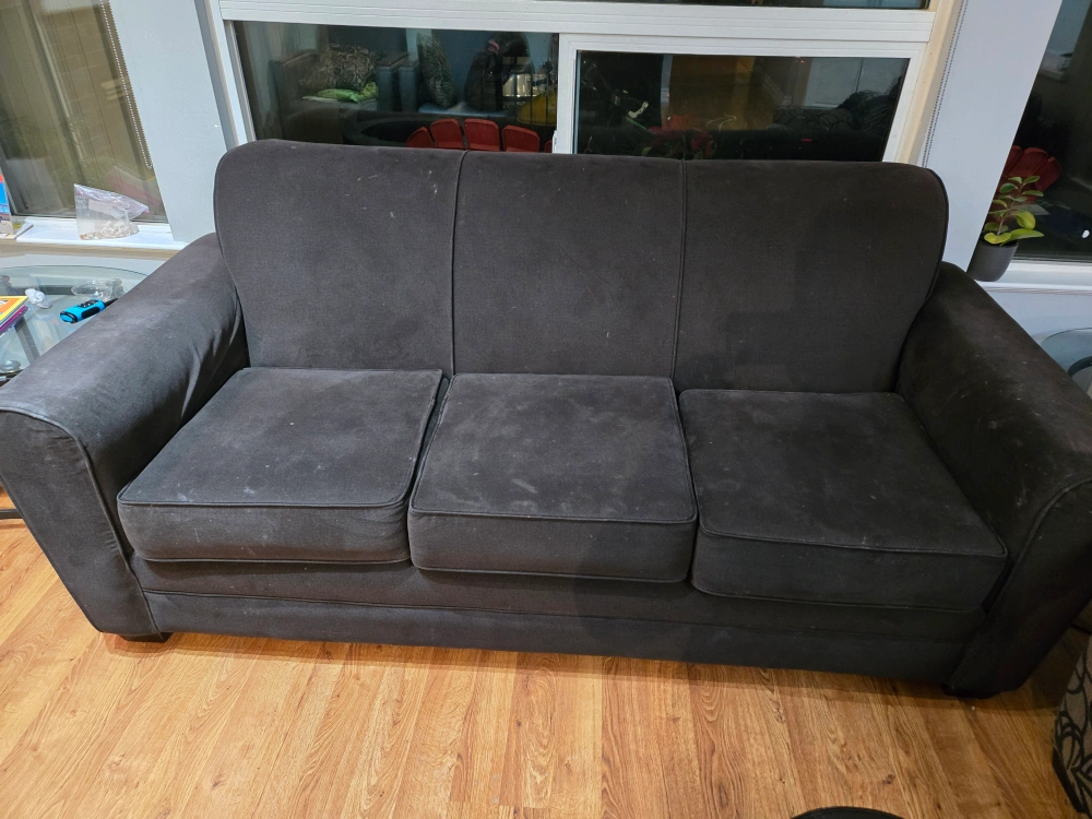 Three-seater sofa, dark brown fabric. Solid wood legs. No rips or tears. Seats are firm. In good shape. one piece, so you would need a bigger vehicle to fit in. I will give a Red color couch cover for free. Pickup location: 184 St and 66 Ave, Surrey
