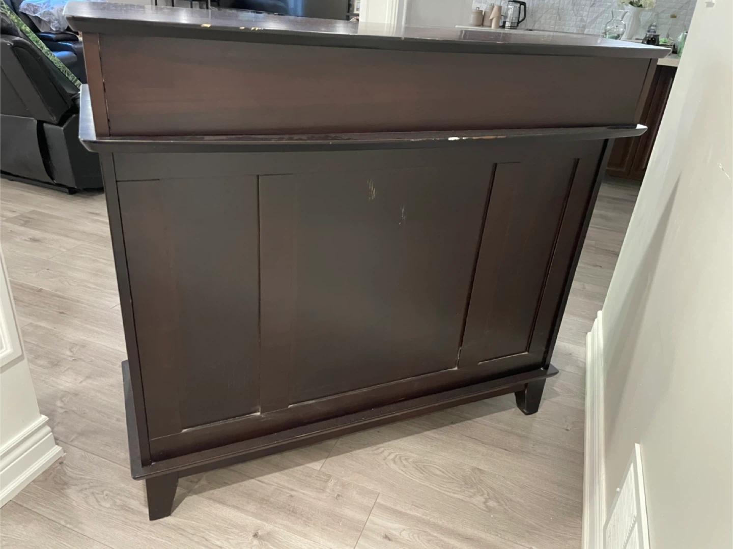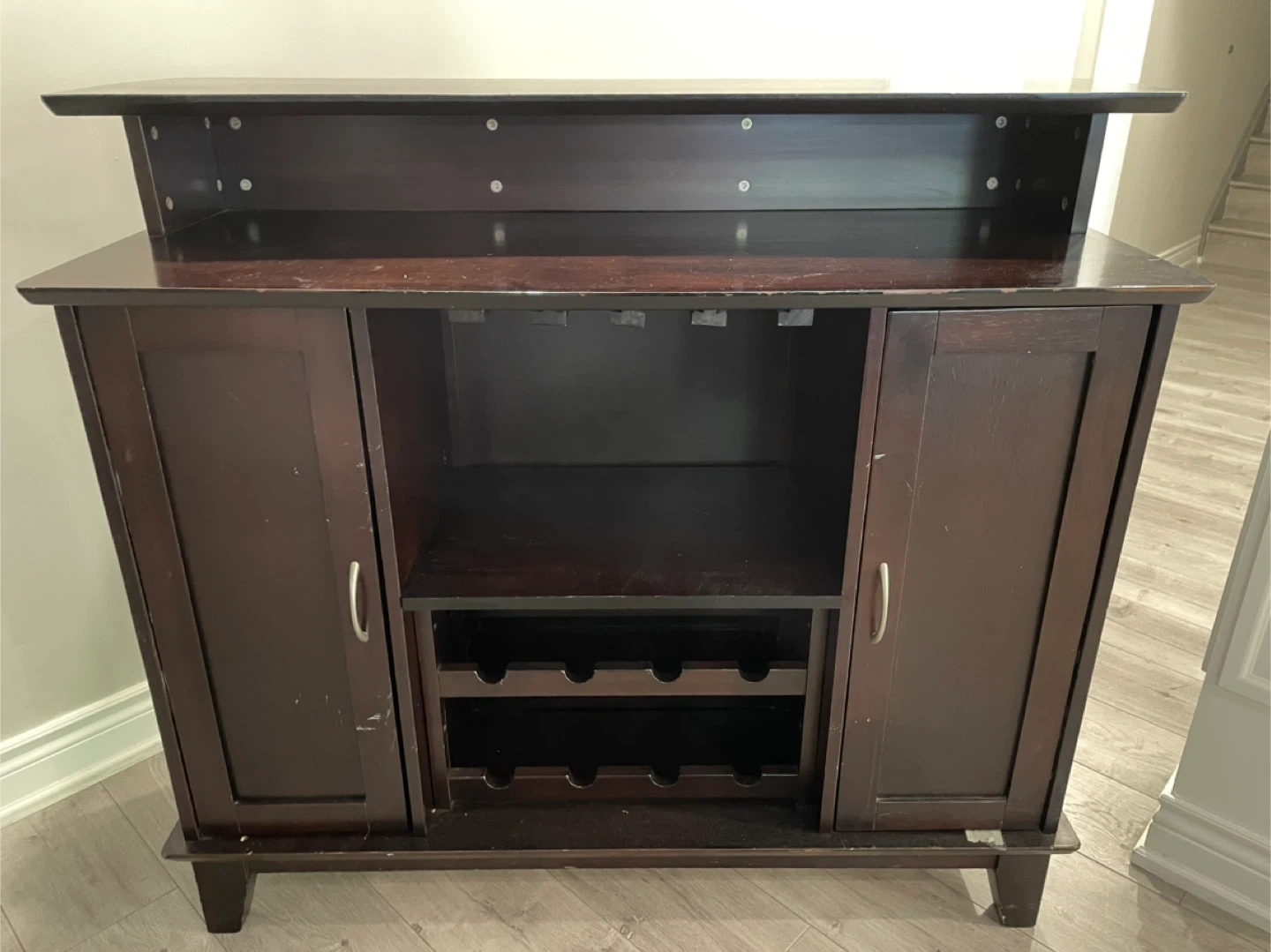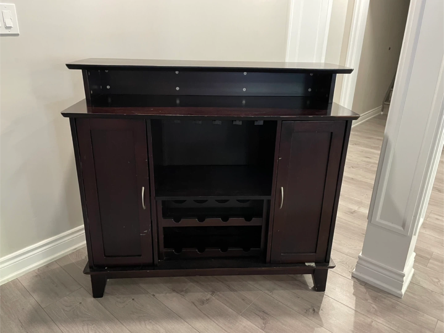 Selling a dark brown bar cabinet! It features two doors, a wine rack, and a top shelf for glasses or bottles. It would be a great addition to any dining room or entertaining space. There are some scratches on the surface, as shown in the photos