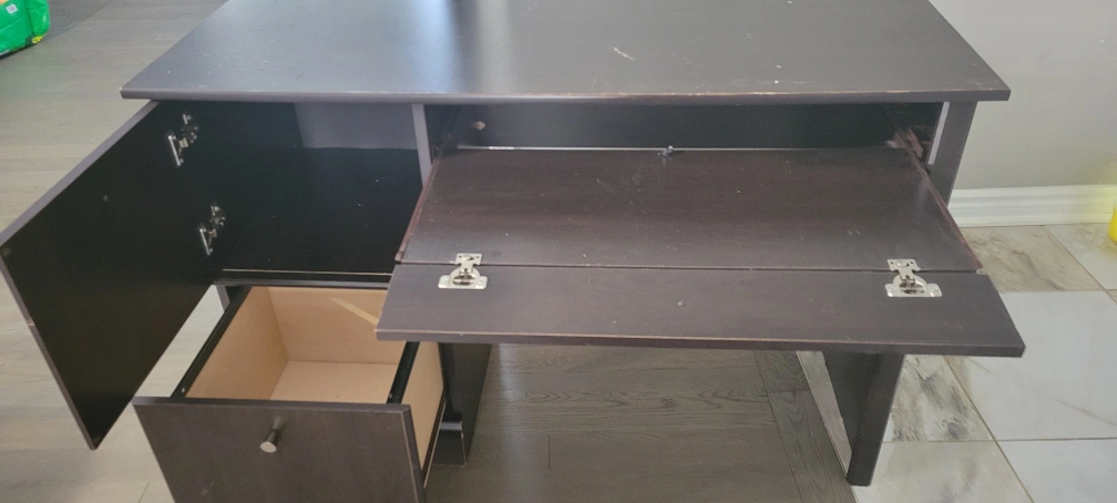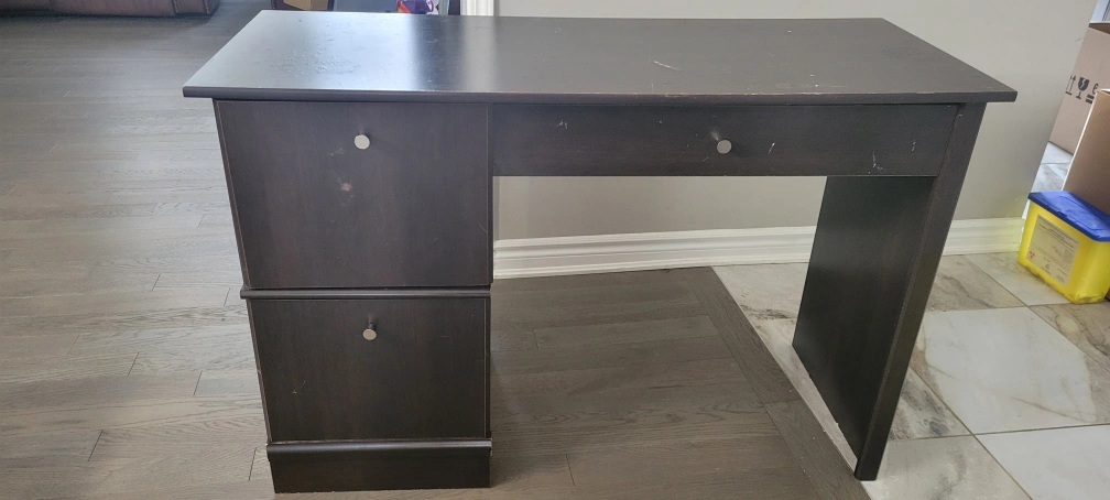 Selling a dark brown desk that's perfect for a home office or study space. It features a drawer and a cabinet for storage, helping you keep your workspace tidy and organized. It has some signs of use.