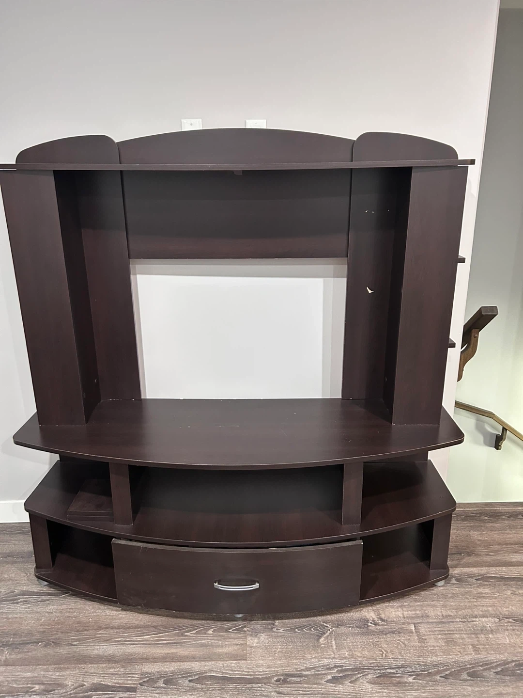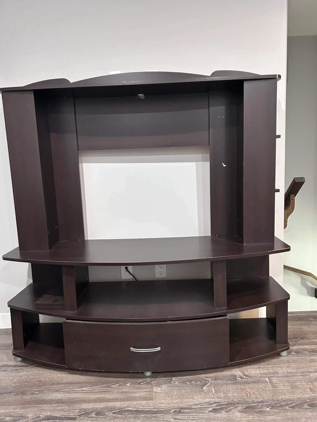 Selling a dark brown entertainment center in good condition! It features multiple shelves and a drawer for storage. Perfect for organizing your TV, media players, and other items in your living room or entertainment space