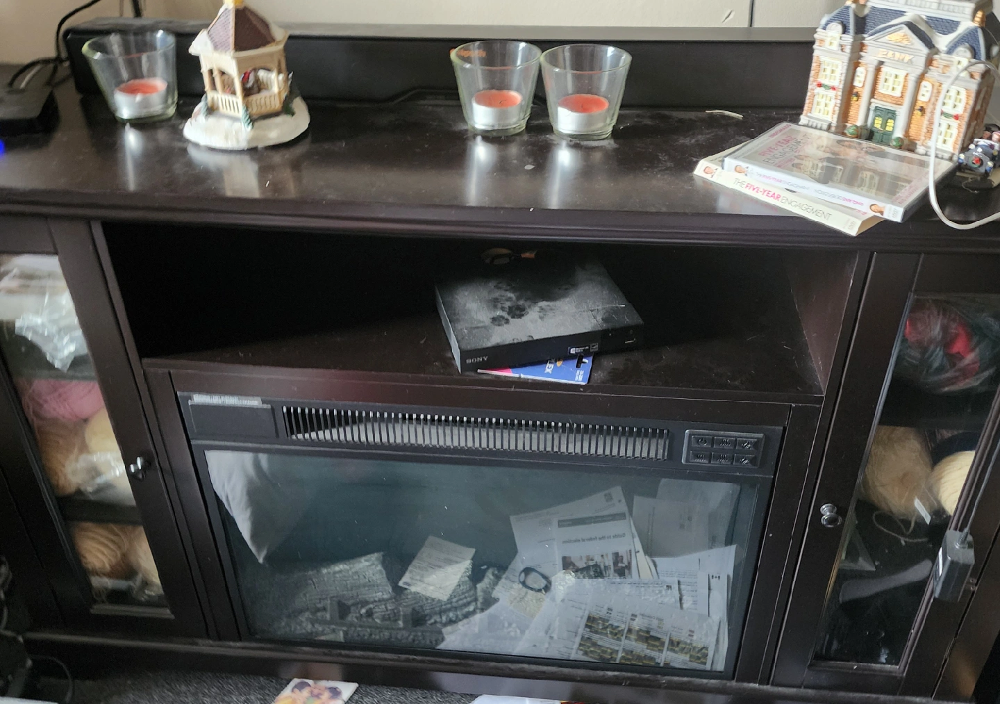 Selling a dark brown entertainment unit. It features a built-in fireplace, perfect for cozying up during those chilly Canadian evenings. The unit also has glass door cabinets and open shelving for storage and display