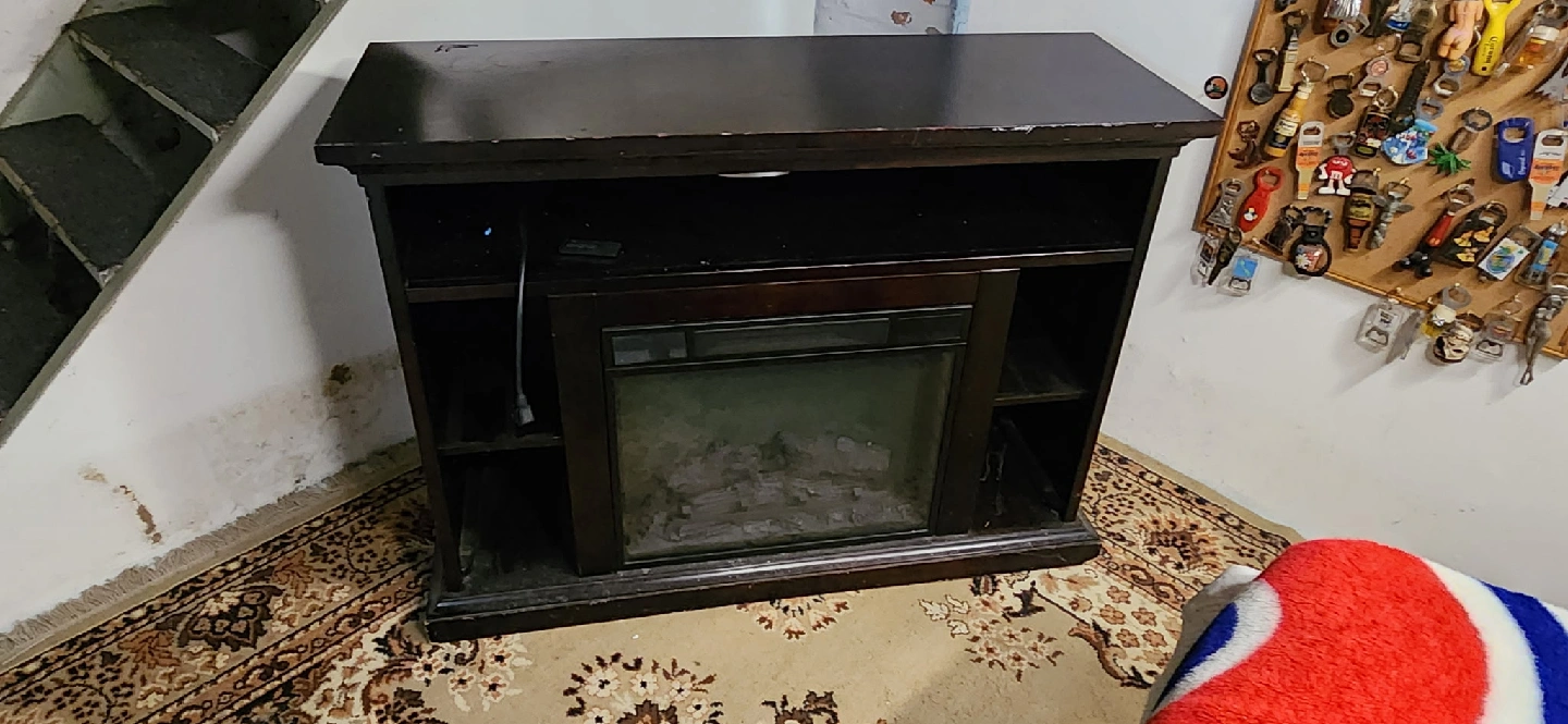 Selling a dark brown fireplace TV stand. It has a faux fireplace insert and shelves on either side for storage. It's in good condition and would be a great addition to any living room or basement! Comes with remote