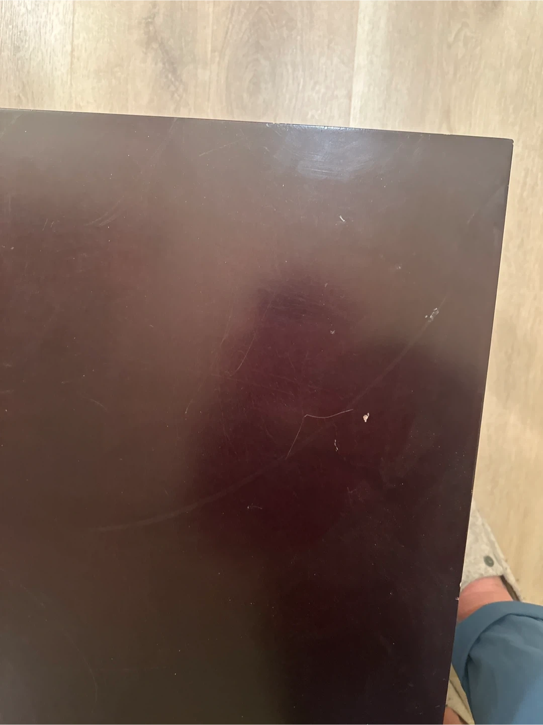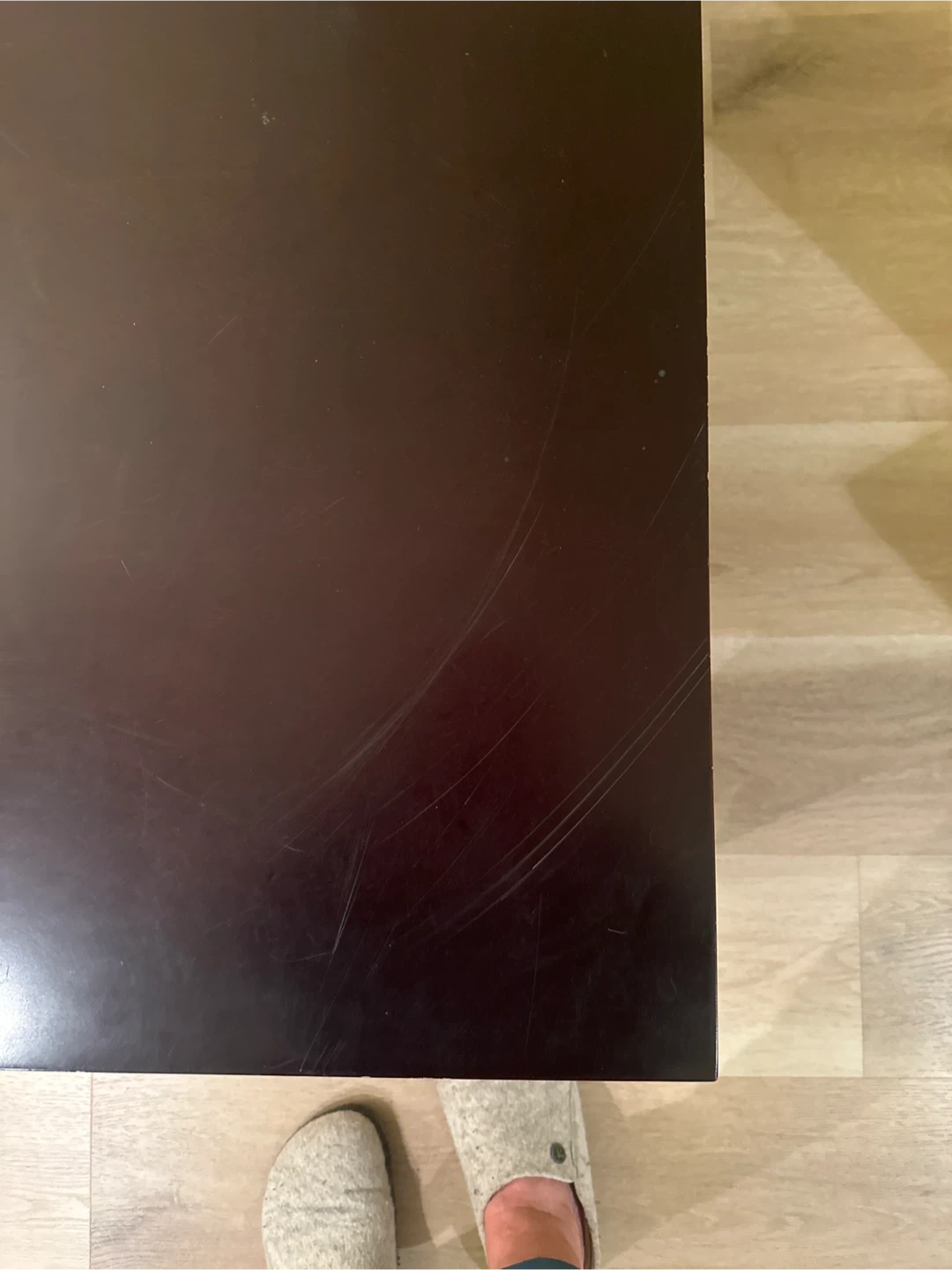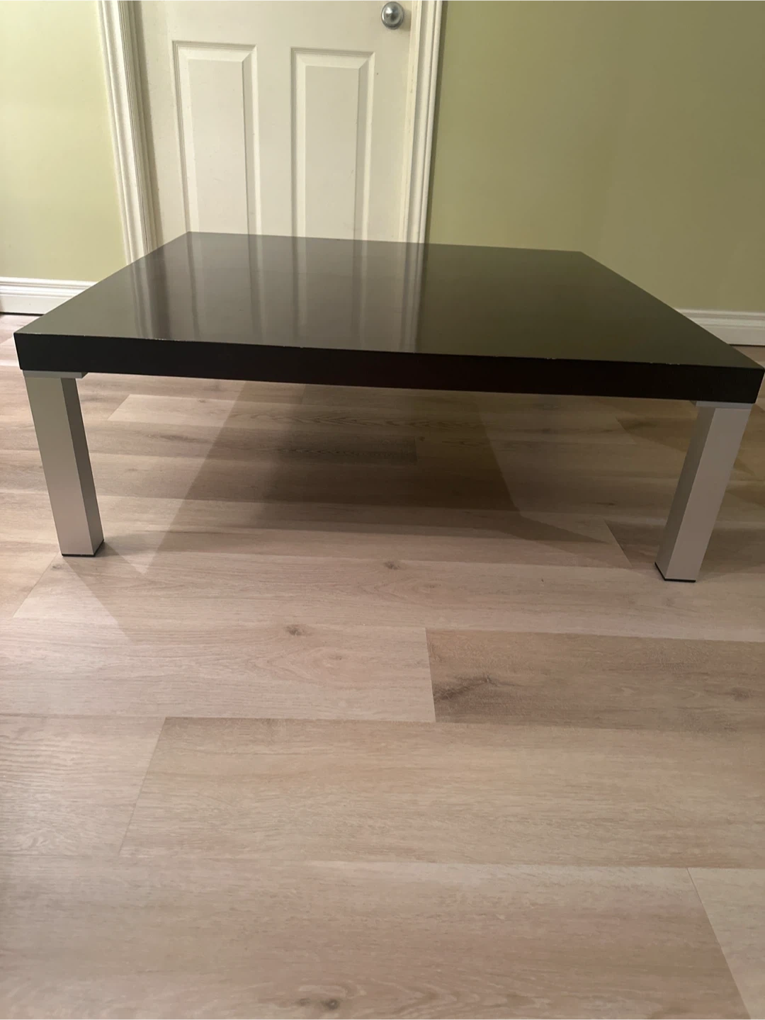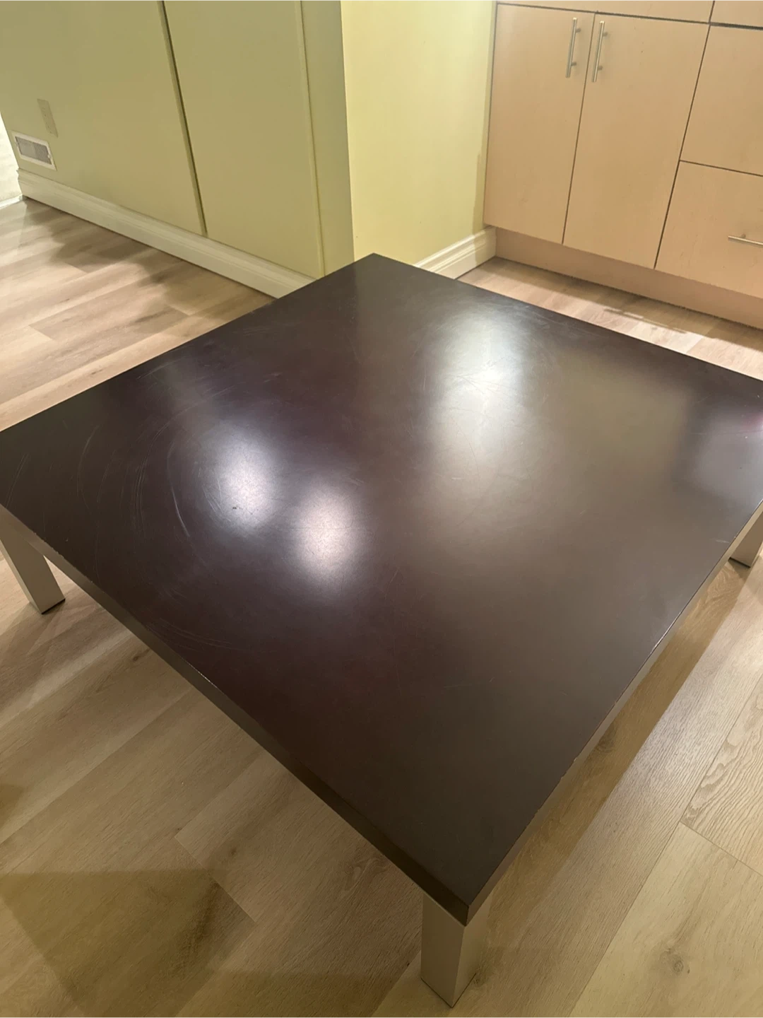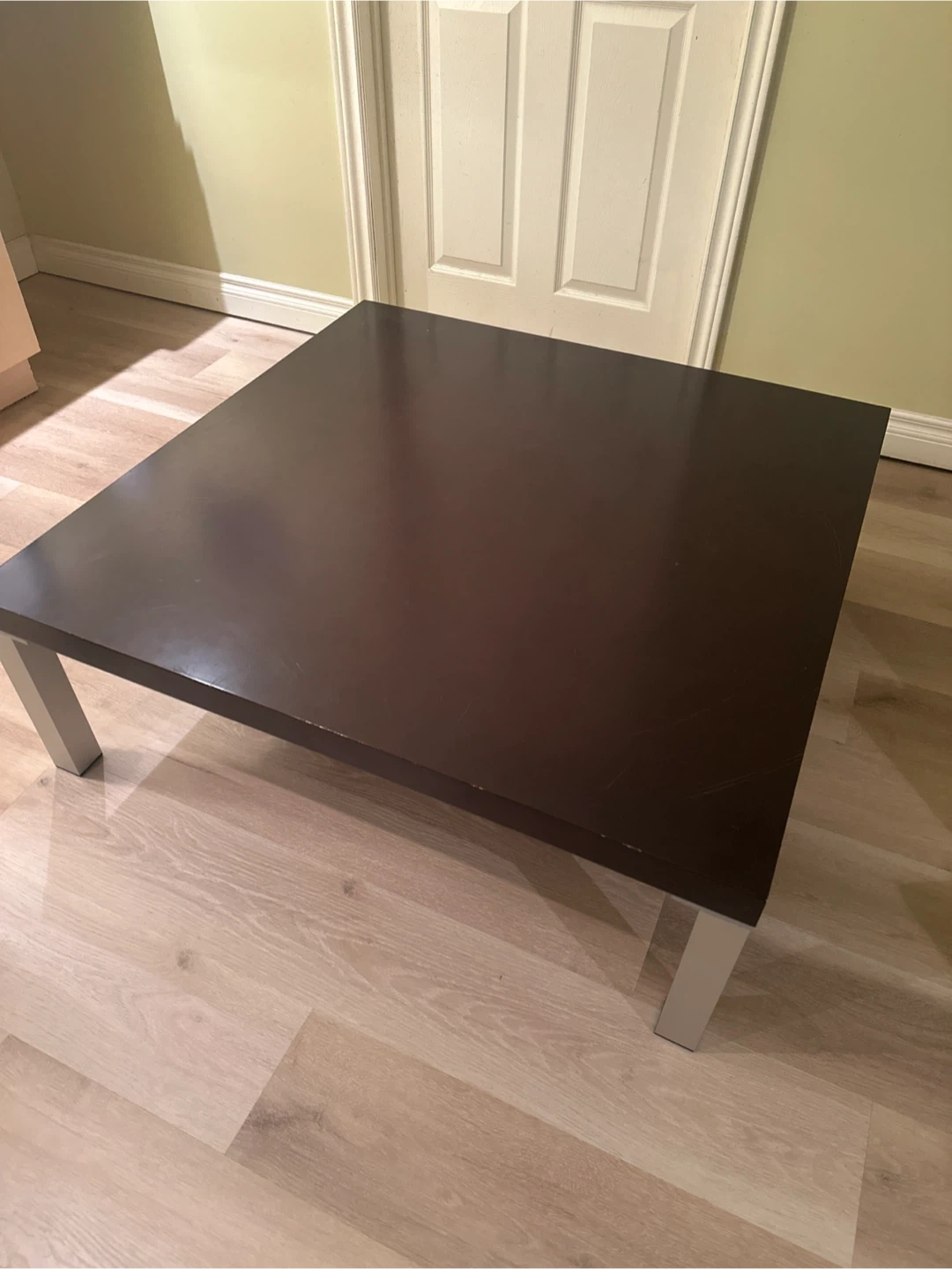 Selling a dark brown square coffee table. It has a few scratches on the top surface, but otherwise it's in good condition. The legs are a silver colour. Great for a living room or rec room!๐ฅ