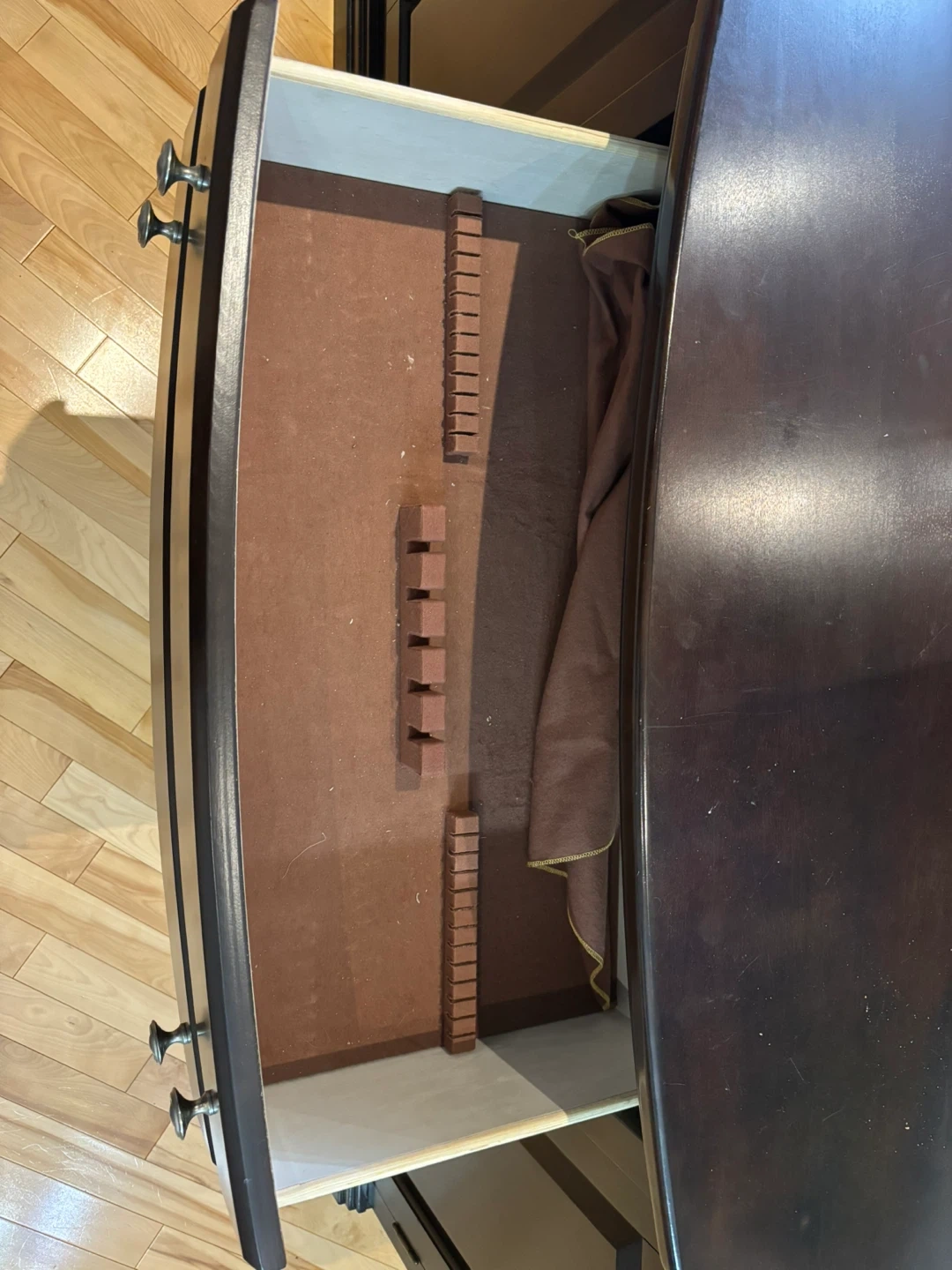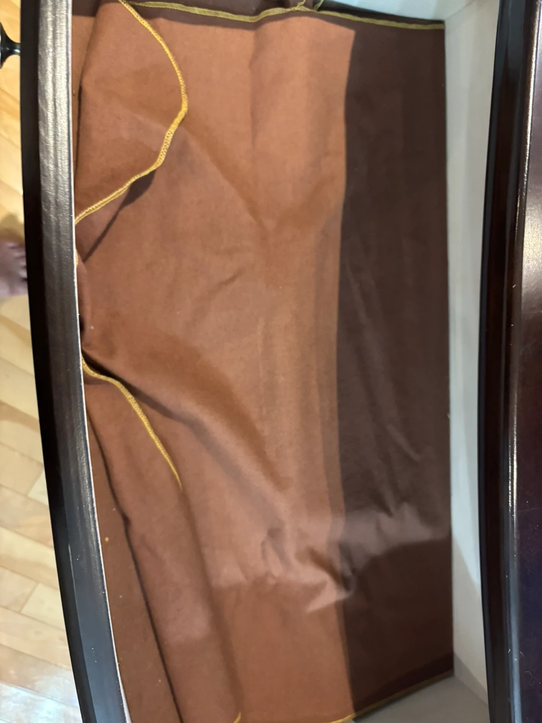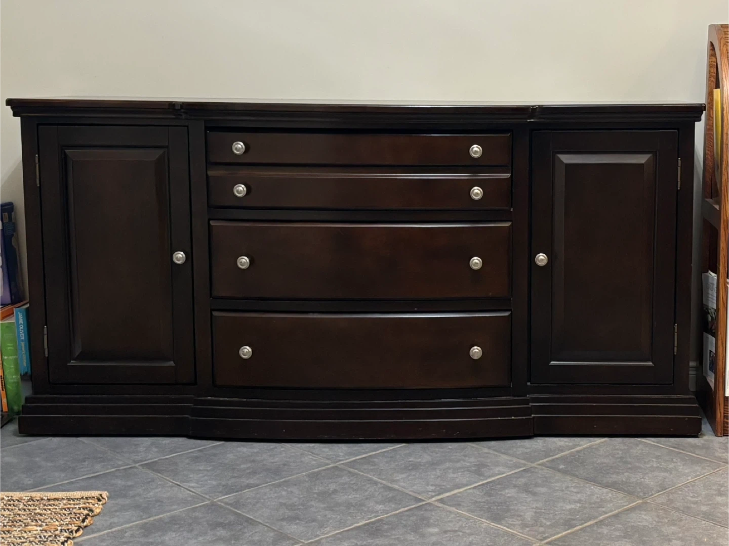 Selling a lovely dark brown wood buffet or sideboard. It features both drawers and cabinets for ample storage. The drawers are lined with a brown cloth material. Perfect for a dining room or living room!