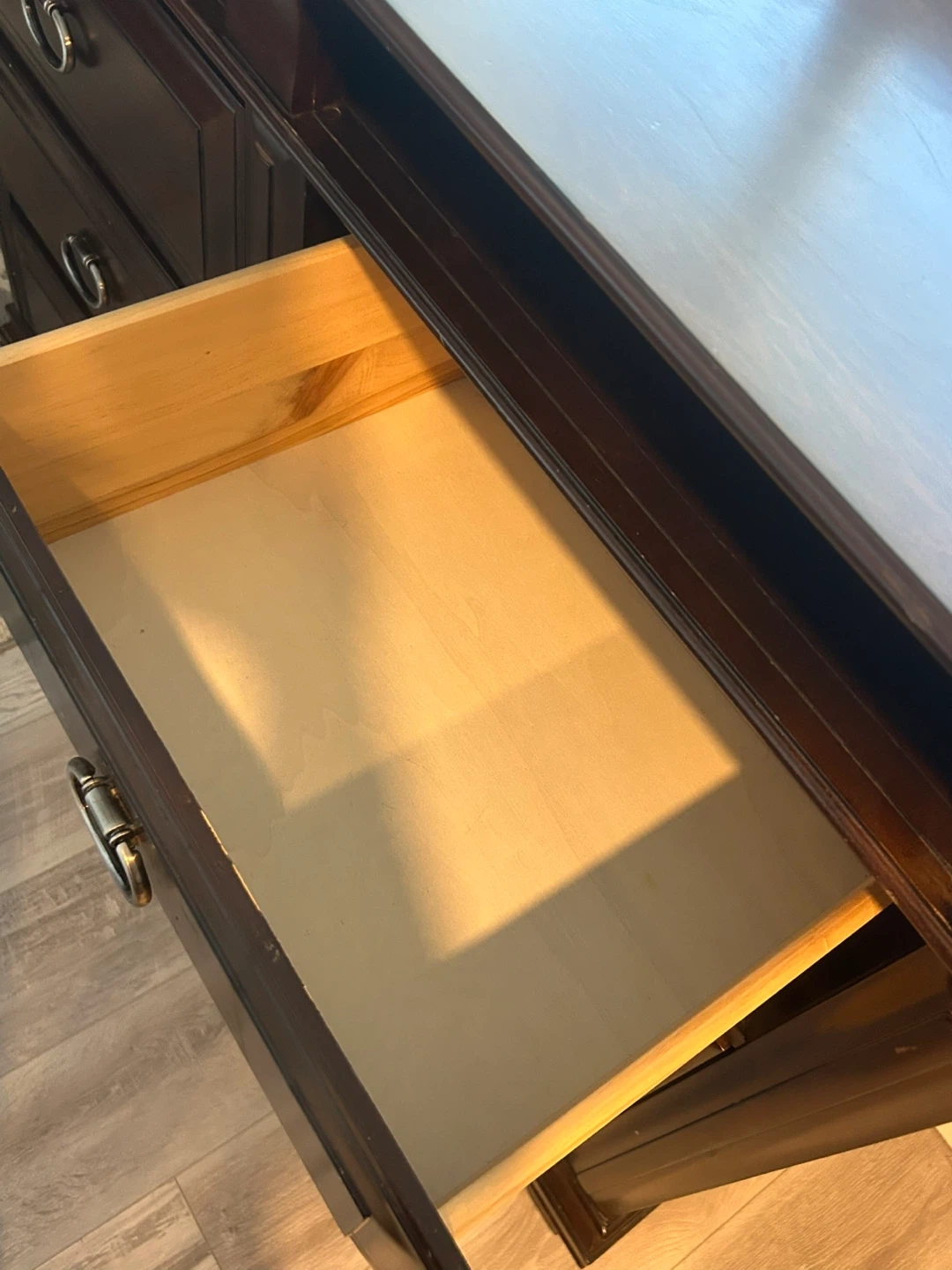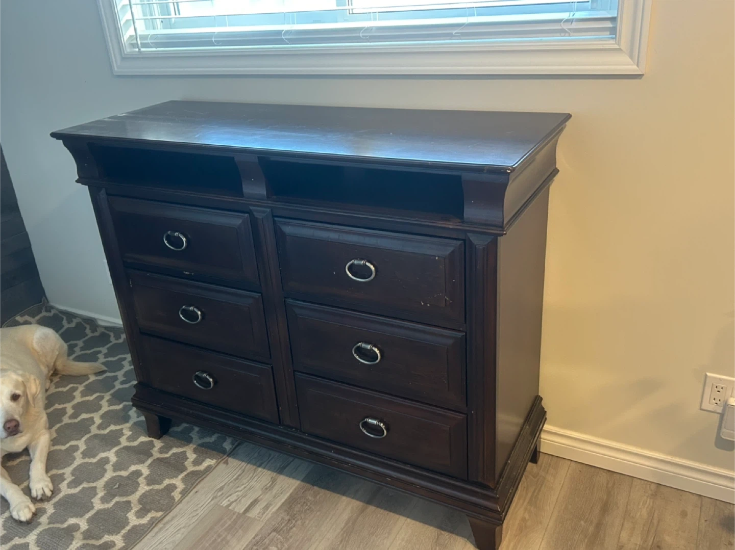 A lovely dark brown wooden dresser with six drawers. It's in good condition and perfect for adding some extra storage to your bedroom or living space. The drawers slide smoothly, making it easy to access your belongings. A few minor scratches are visible, but overall it's a sturdy and functional piece of furniture 52” wide x 19” deep x 42.5” high
