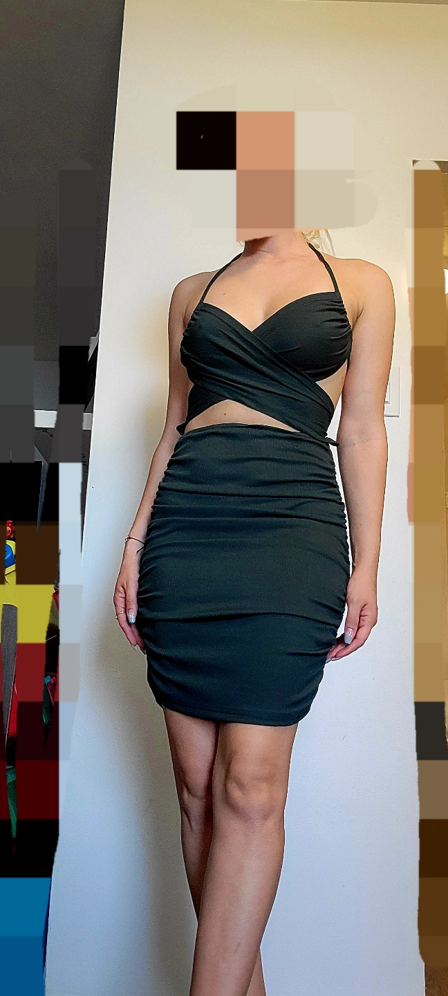 Stunning dark green mini dress. Features a halter neck, cut-out sides, and a fitted silhouette. Back tie closure. Perfect for a night out.
