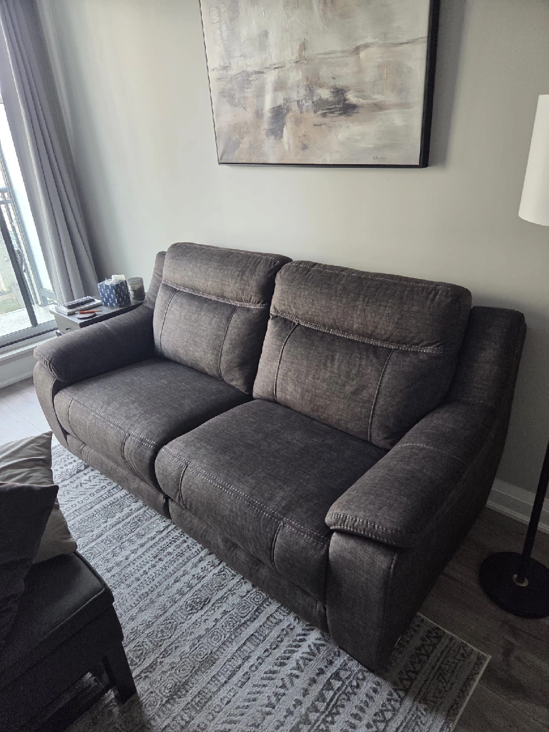 Must sell , Martha Stewart two-seat sofa! It's in great condition and would be perfect for a living room or den. The fabric is a nice neutral dark grey, and the size is ideal for smaller spaces
