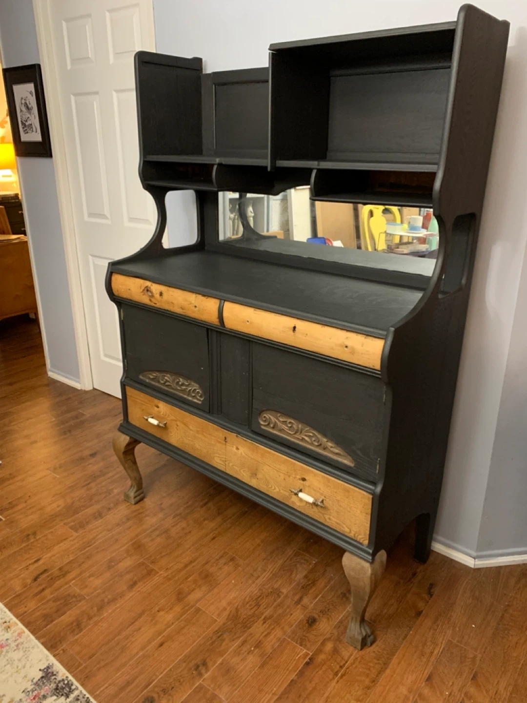 Selling a charming dark grey painted wood hutch! It features a unique design with a mirrored back, open shelving, and drawers for storage. It would be a great addition to any dining room or kitchen for displaying dishes or storing essentials. The hutch has a rustic feel and is in good condition.