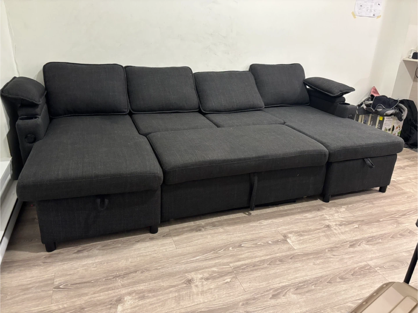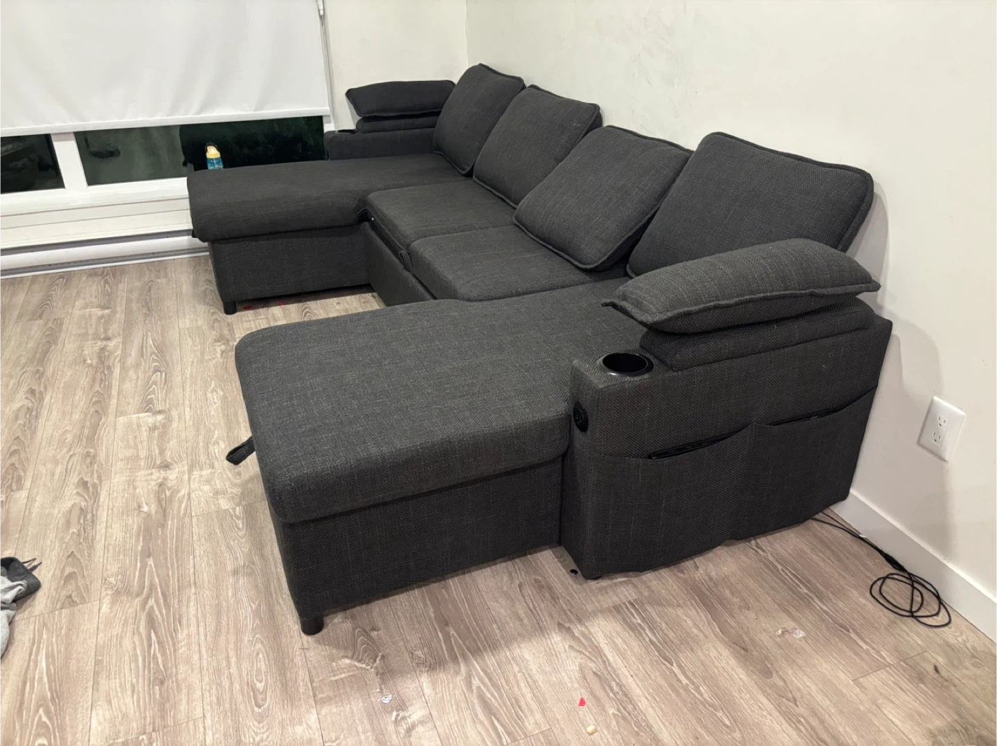 Selling a dark grey U-shaped sectional sofa. It features convenient storage compartments and a cup holder on one side. It's in great condition and very comfortable. The dimensions are approximately 104.3" x 93.7" x 45.3". Each seat can hold up to 300 lbs and it comes in 4 packages for easy assembly