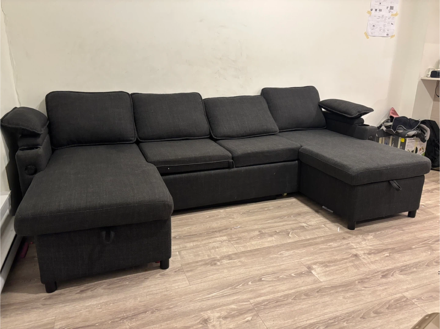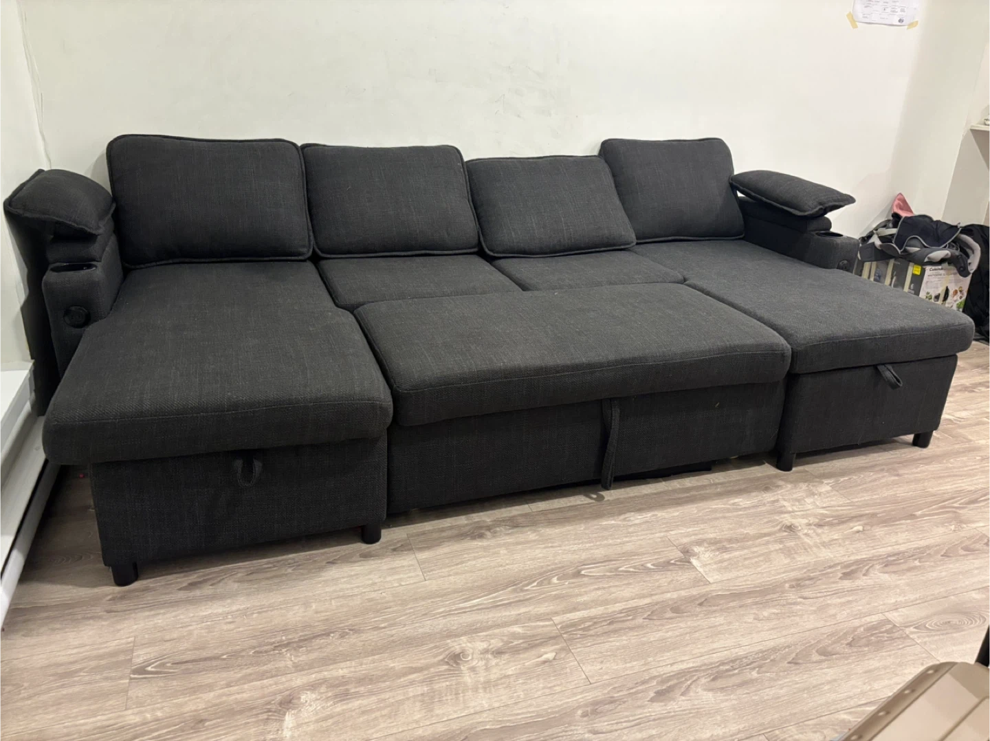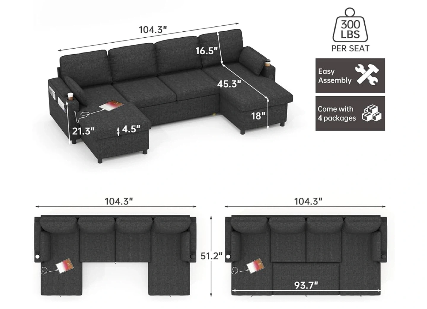 Selling a dark grey U-shaped sectional sofa. It features convenient storage compartments and a cup holder on one side. It's in great condition and very comfortable. The dimensions are approximately 104.3" x 93.7" x 45.3". Each seat can hold up to 300 lbs and it comes in 4 packages for easy assembly