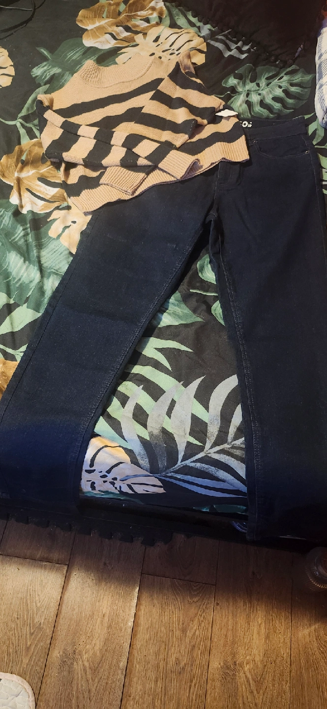 Selling a pair of dark wash denim jeans and a striped sweater. Both items are in good condition and ready for a new home. Perfect for casual wear! brand new cute outfit denim jeans are stretchy size 29/30 top size is xs but im a medium and it fits nicely