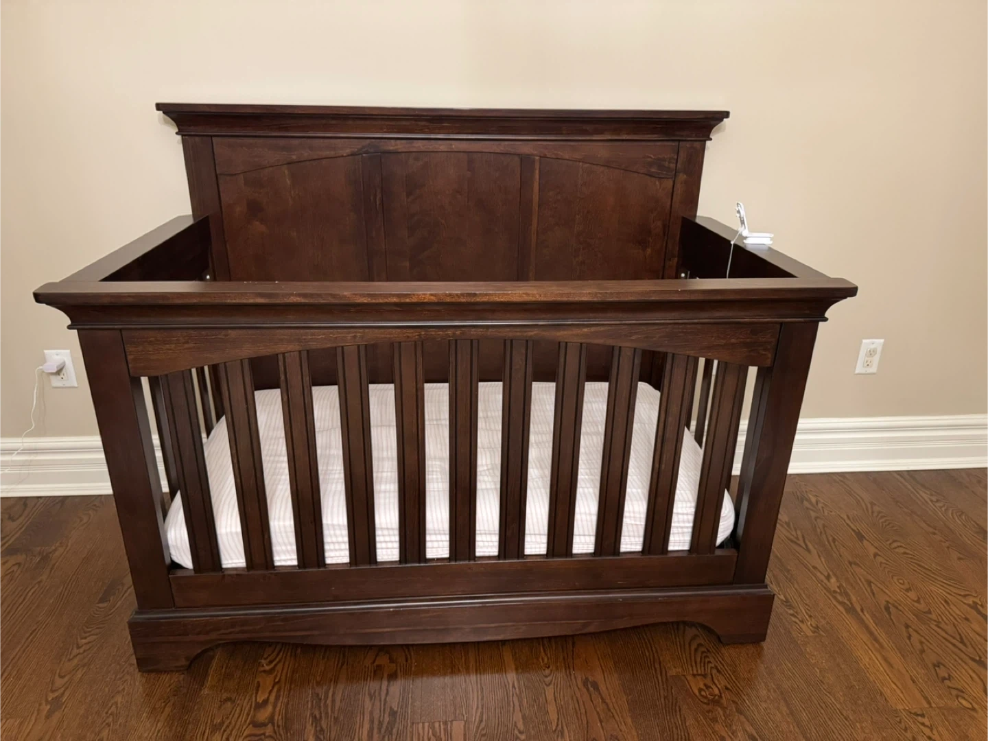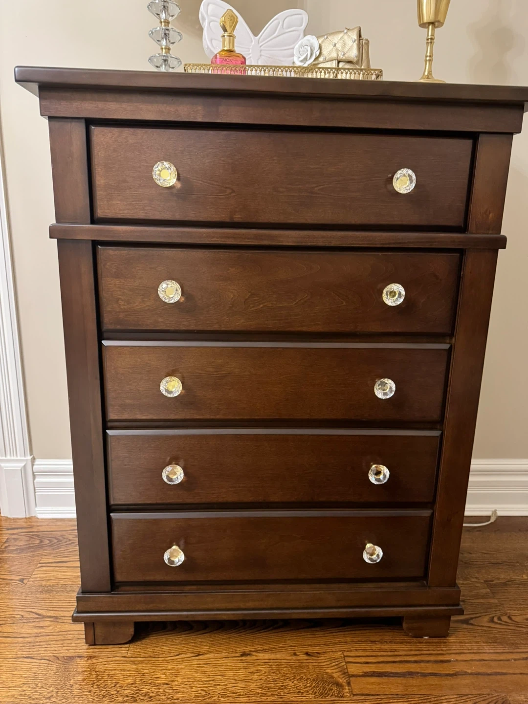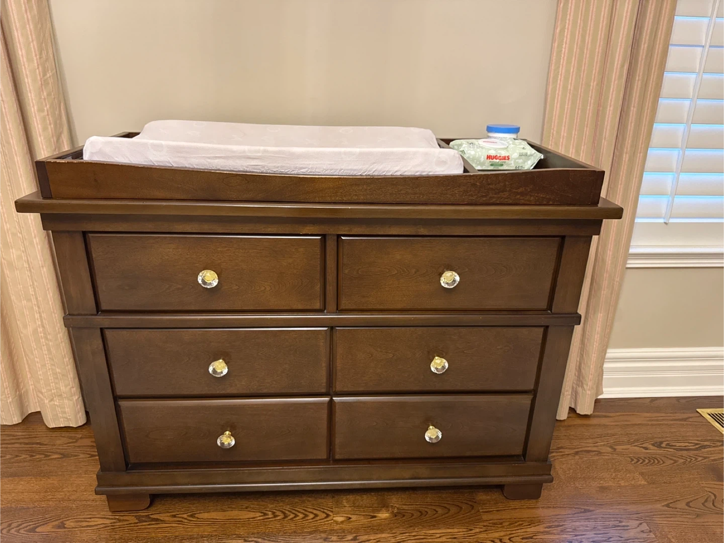 Selling a baby dresser and crib set in a dark wood finish. Both are in great condition and would look lovely in a nursery. The dresser has multiple drawers for ample storage, and the crib is sturdy and safe for your little one. A great set to get started!