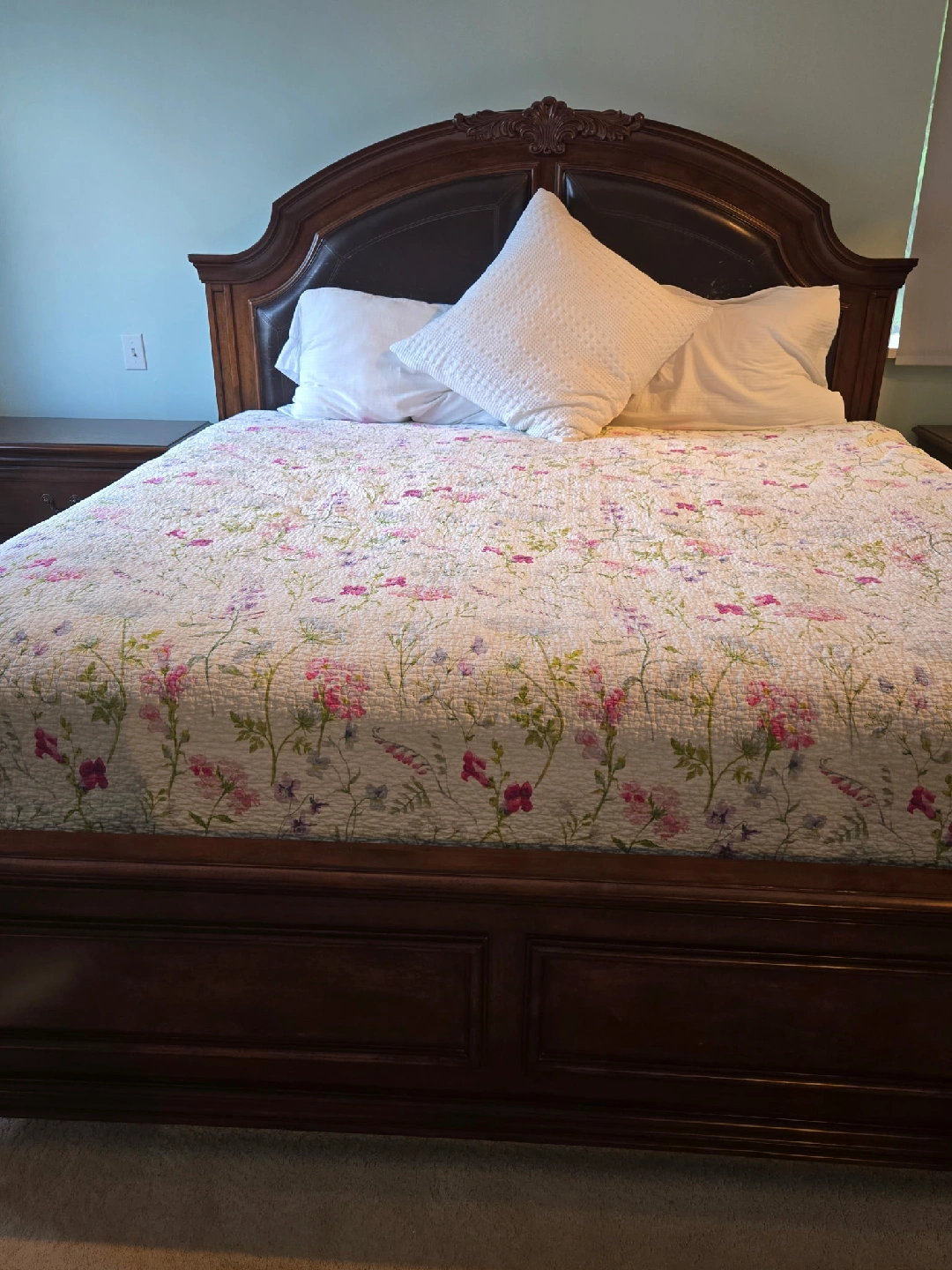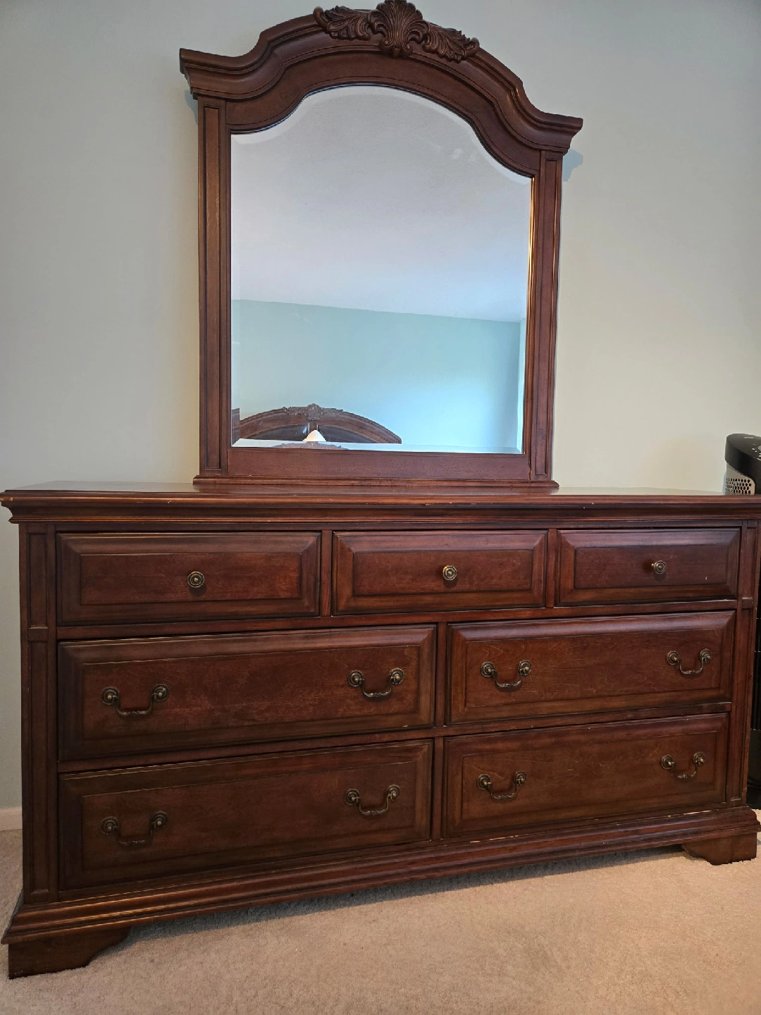 Selling a bedroom set that includes a dresser with a mirror, two nightstand, and a king bedframe. The set is made of dark wood and has a classic design from The Brick. There are some signs of wear, but overall it is in good condition. It would be great for someone looking to furnish a bedroom with a traditional style. Must go soon, with or without the Bed.
