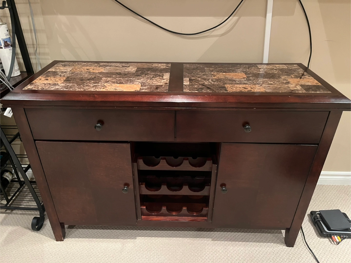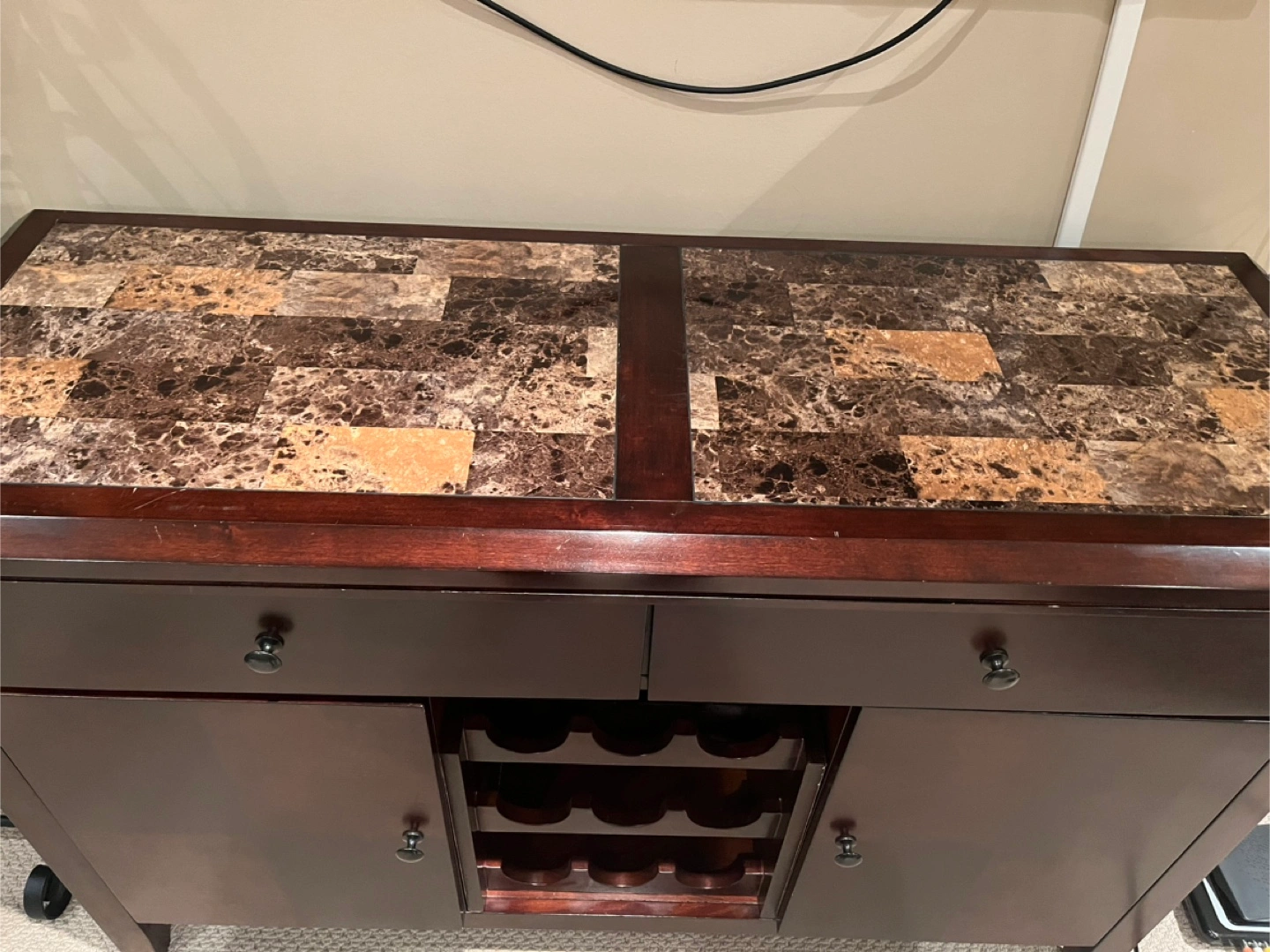 Selling a dark wood buffet with a marble top. It features drawers, cabinet space, and a built-in wine rack. It's perfect for a dining room or living room for extra storage and serving space.