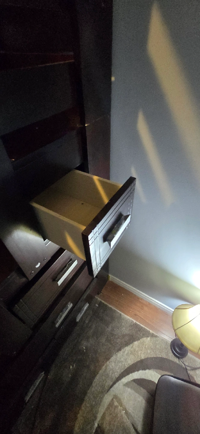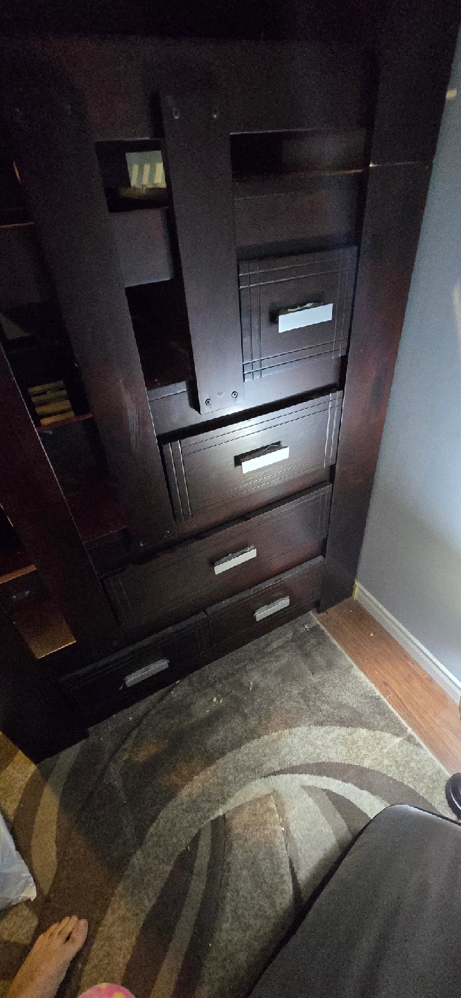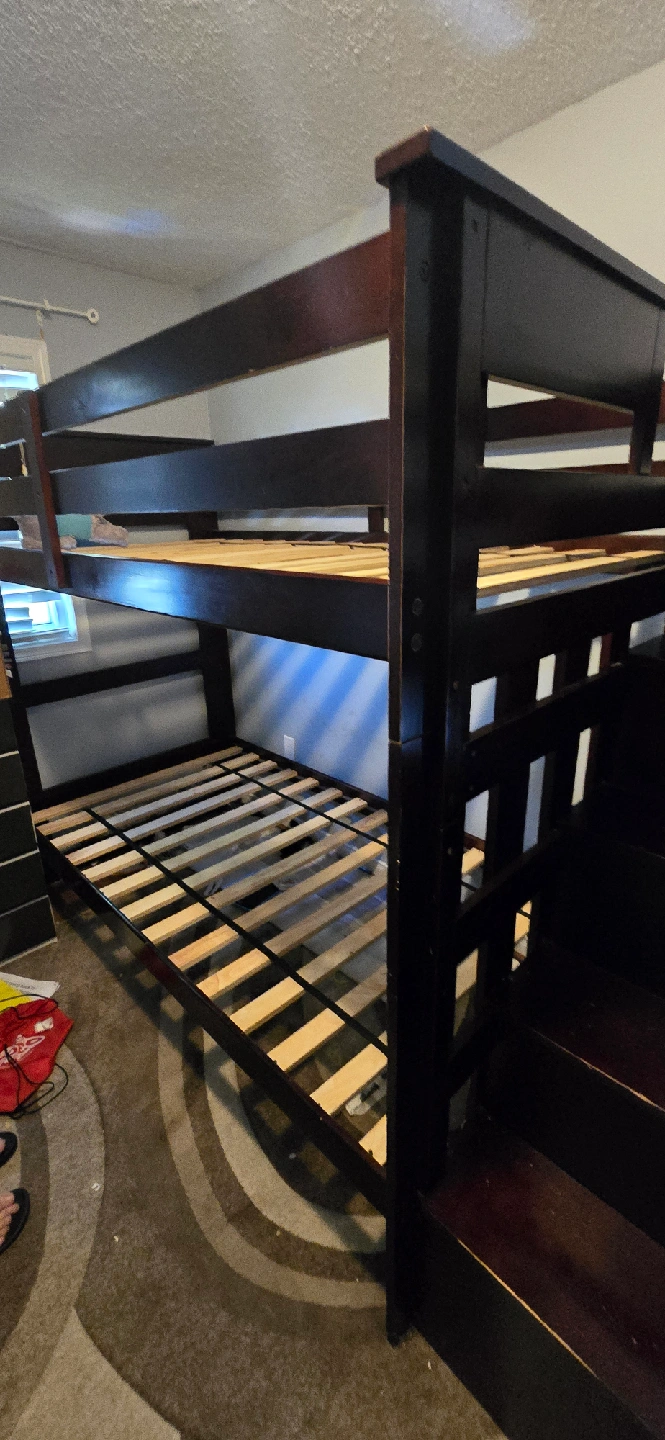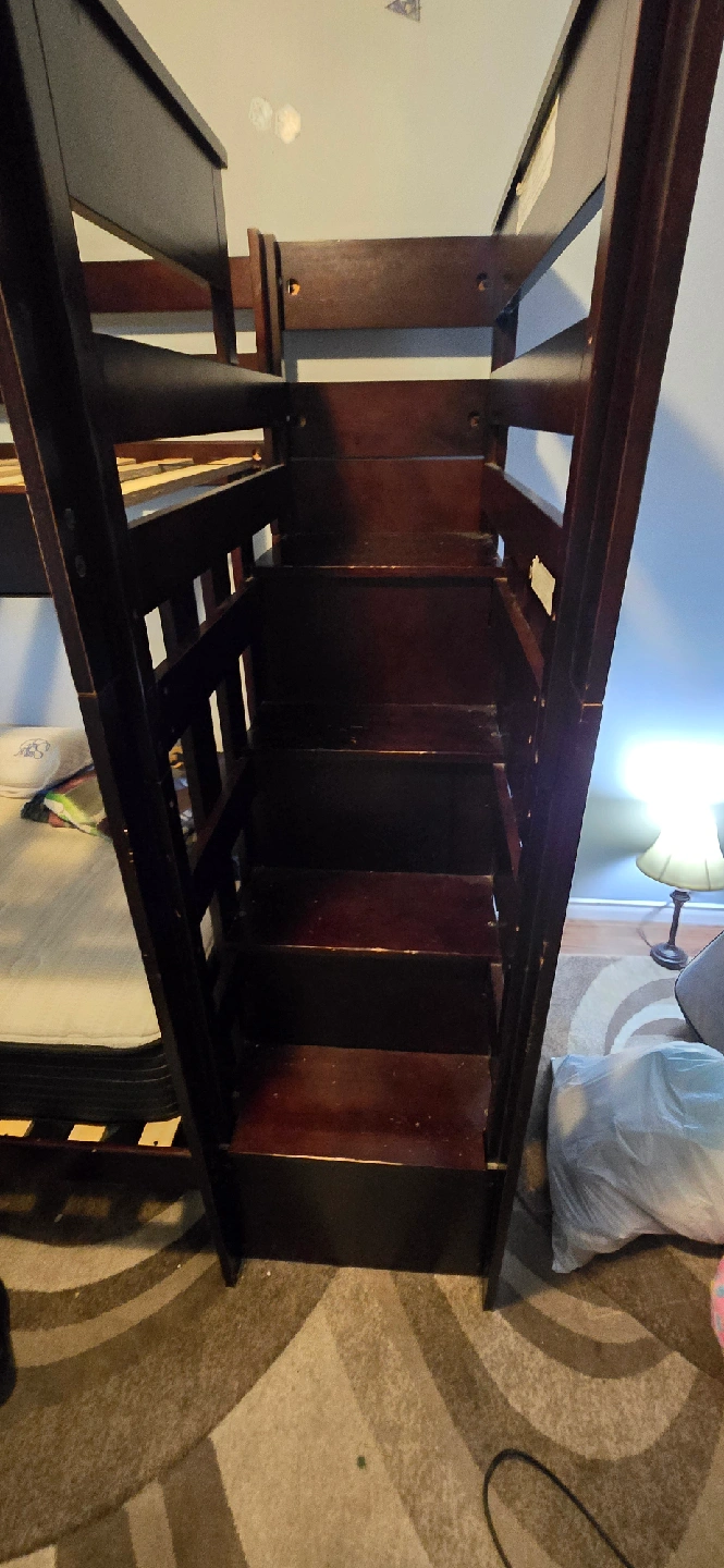 Selling a bunk bed made of dark wood. It features a set of drawers built into the side for extra storage. This bunk bed would be great for a kid's room or a guest room. It also includes a trundle (unassembled-but all parts included). Open to negotiate