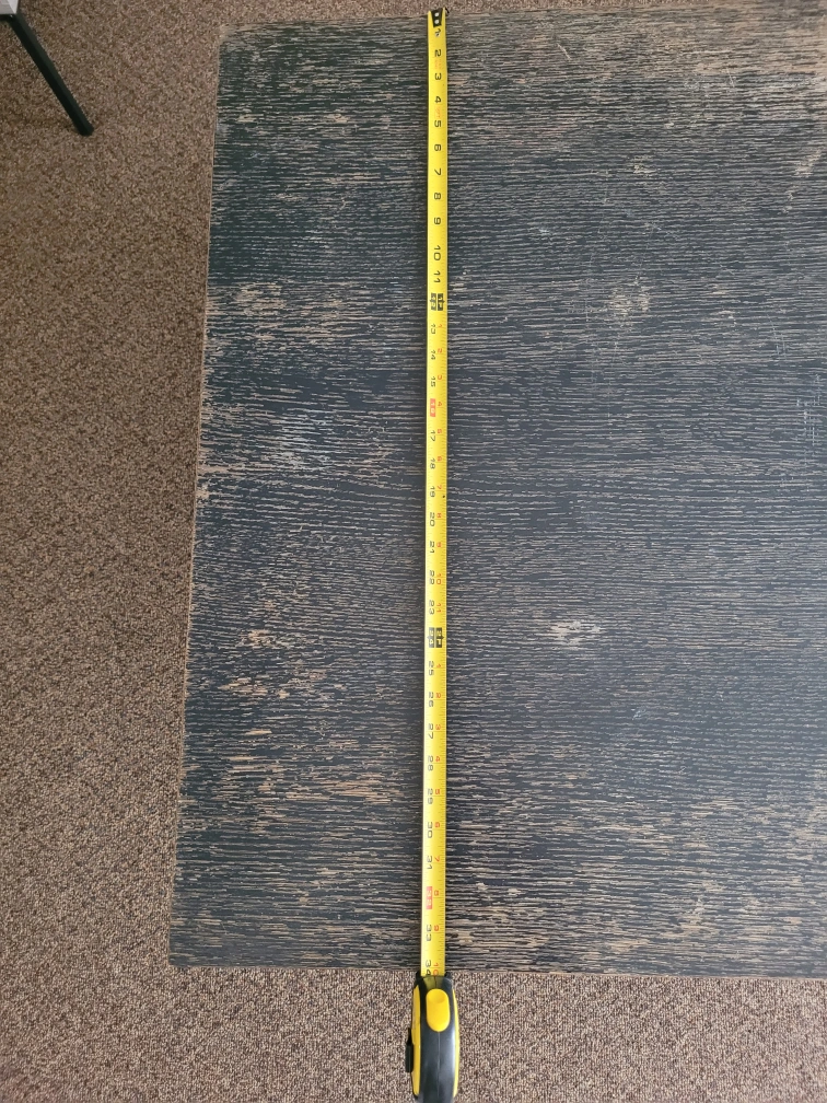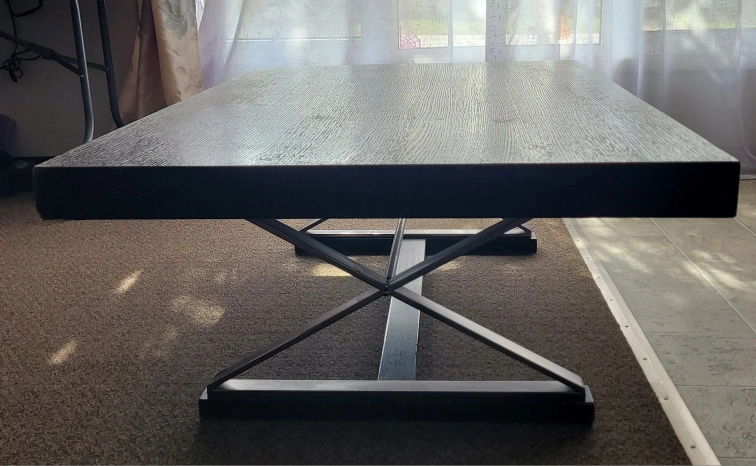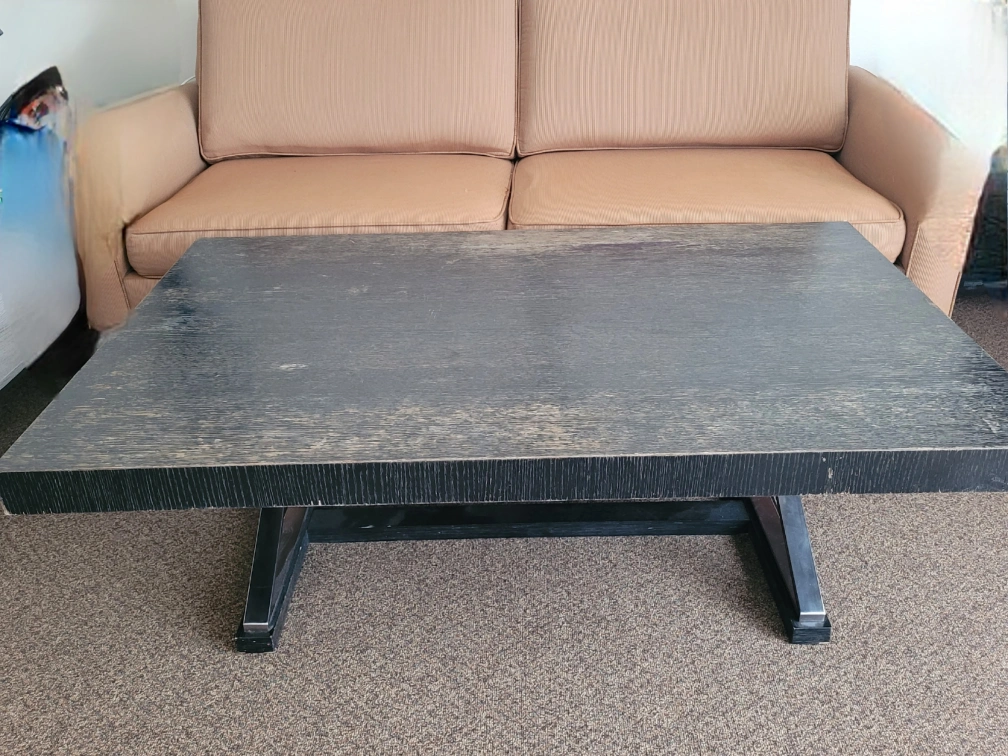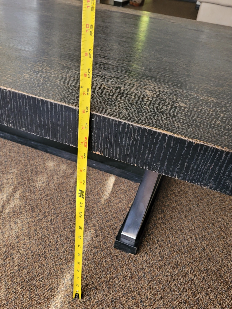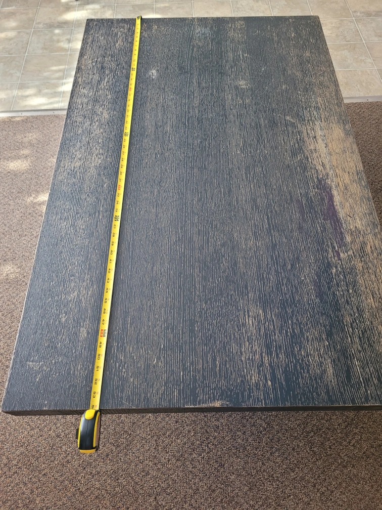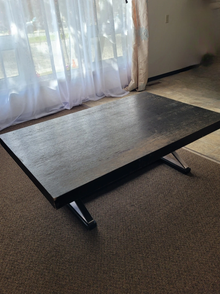 Dark wood coffee table with a metal base. There are some signs of wear on the top surface. Please see photos for details on the condition. Need a new fresh paint but anyway it's heavy and sturdy coffee table. Dimensions are 54" long and 34" wide and 18 height