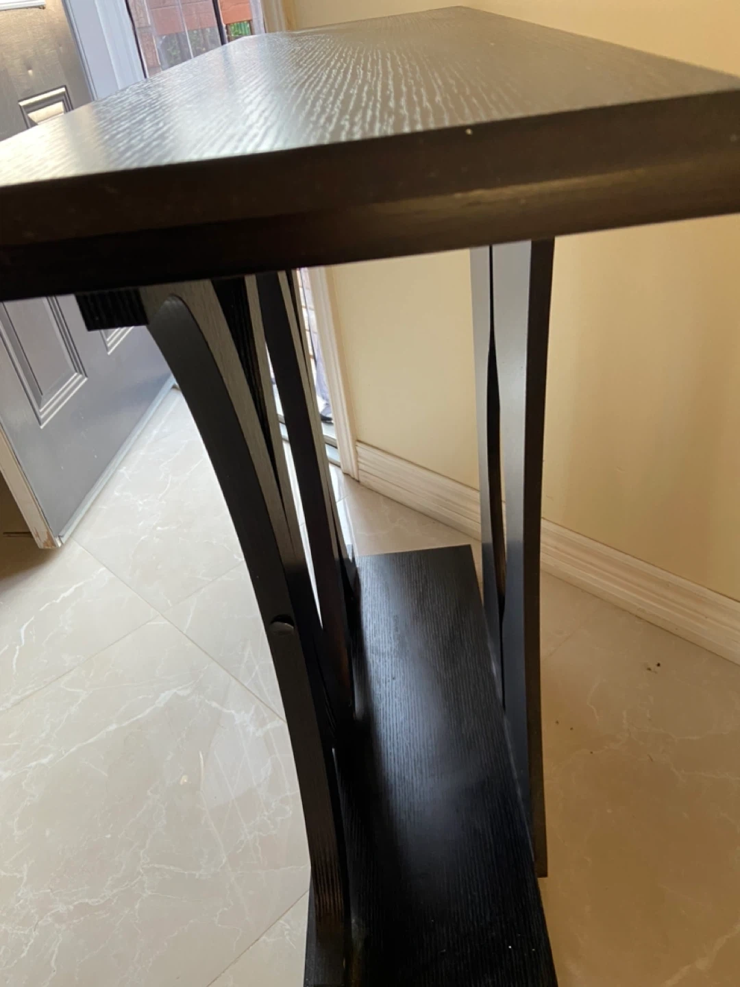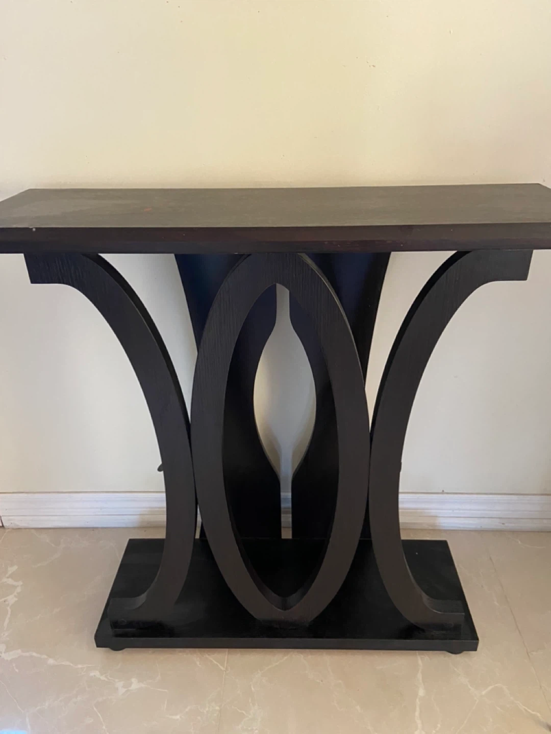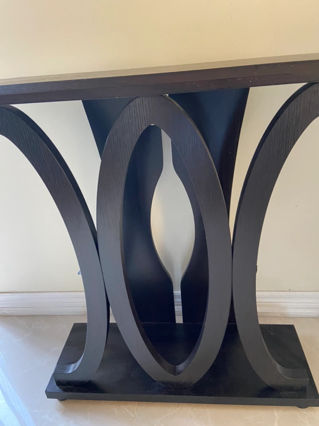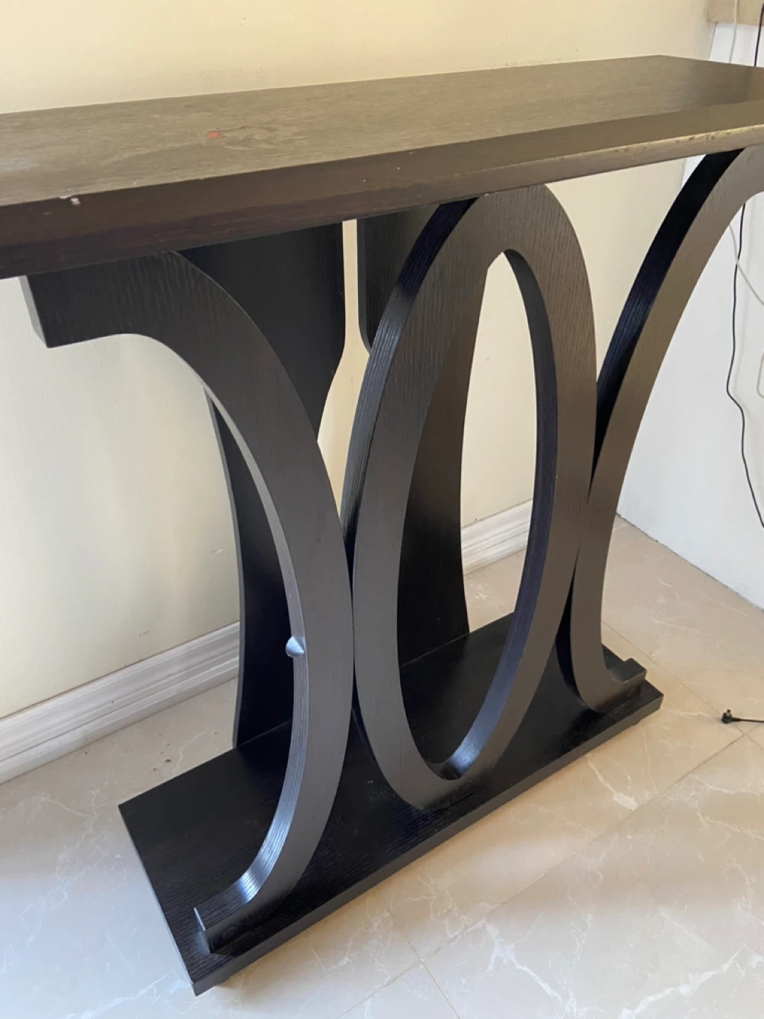 Selling a stylish dark wood console table! It's in great shape and would look lovely in an entryway or living room. The unique design of the legs adds a touch of elegance to any space. It's a sturdy and functional piece of furniture