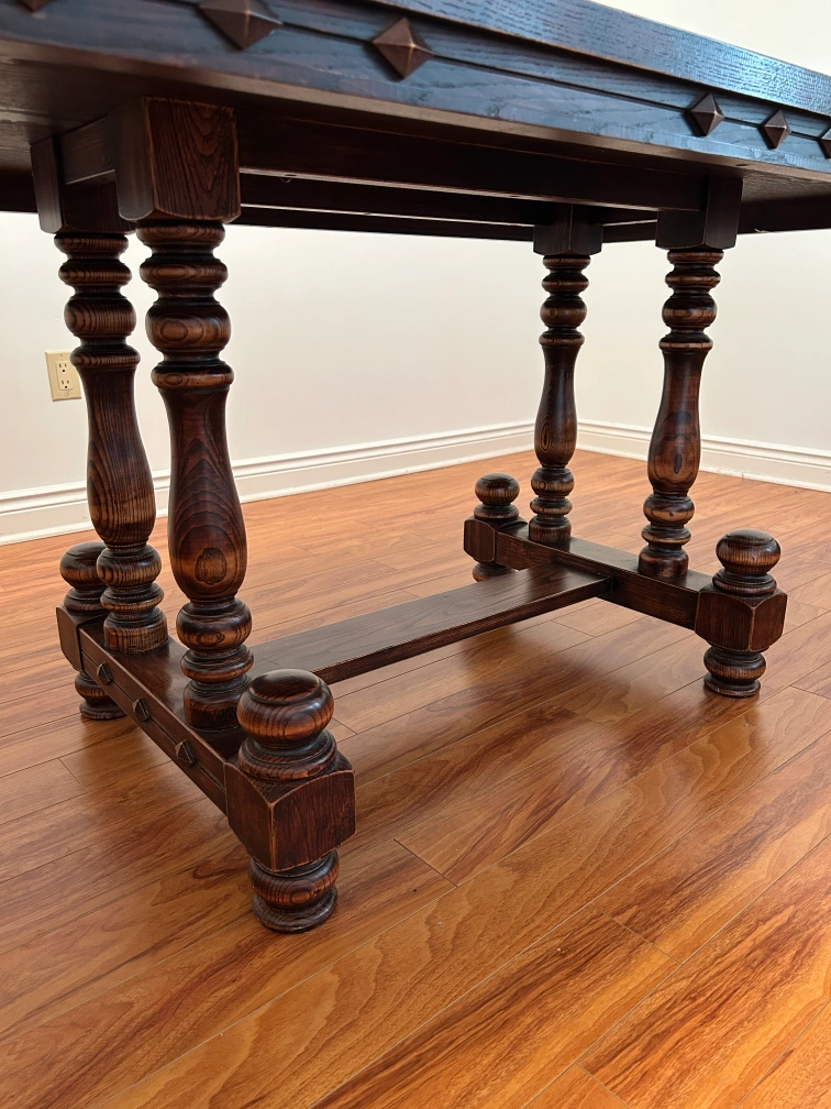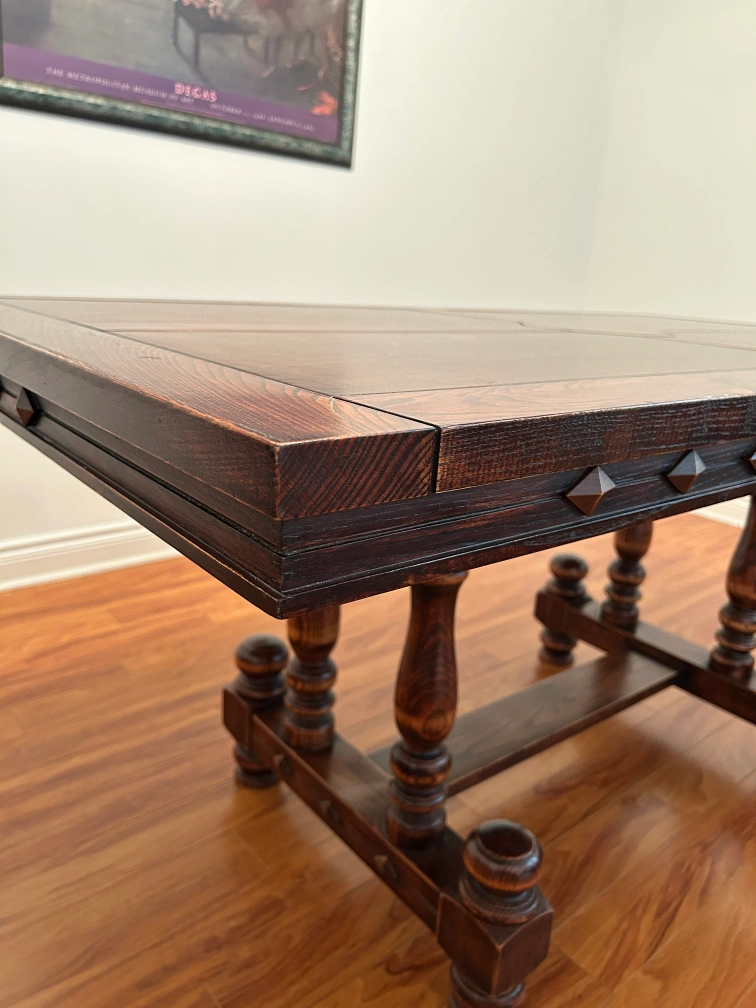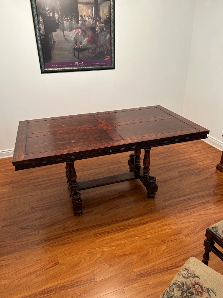Selling a beautiful dark wood dining table that comes with six matching chairs. It's a sturdy and stylish set, perfect for family dinners or gatherings. The table has a unique design with detailed legs and a patterned top, while the chairs have floral upholstered seats. It's in great condition and ready to be the centerpiece of your dining room