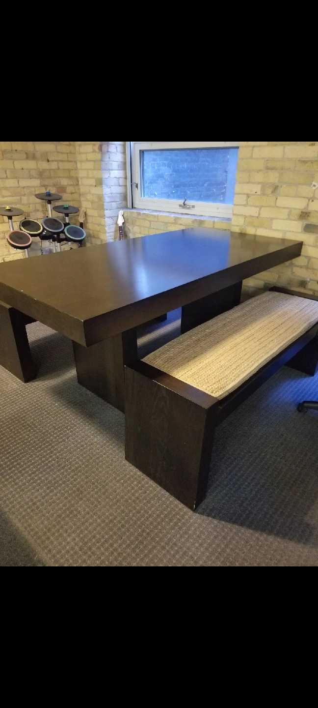 Selling a dark wood dining table with a matching bench. It's a sturdy set and would be great for a dining room or kitchen. The table has a modern, minimalist design. The bench has a woven seat for added comfort. It's in good condition and ready for a new home!