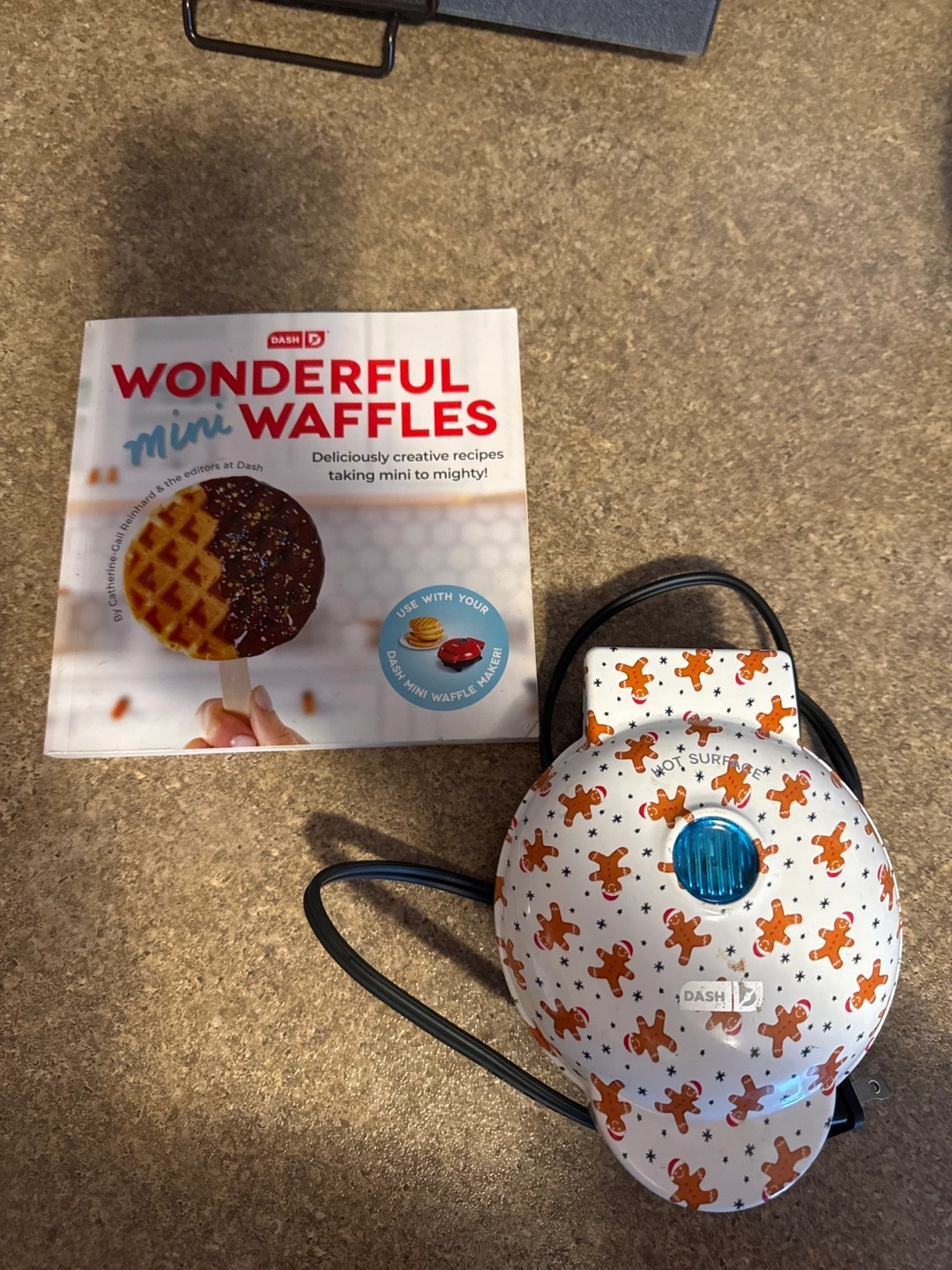 I'm selling a Dash mini waffle maker with a cute gingerbread pattern! It also comes with the Wonderful Mini Waffles recipe book, for some creative waffle ideas