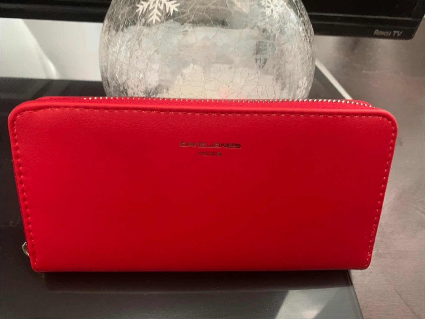David Jones Paris- Cherry red faux leather clutch wallet. Very functional wallet with a zippered closure and many interior compartments. The interior colour is blue and lots of credit card slots a small zippered change section and an open section for receipts. Never used. Brand new Bought 80 selling 40
