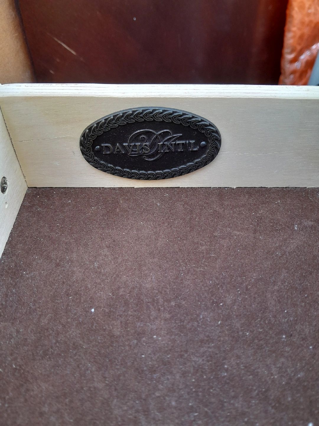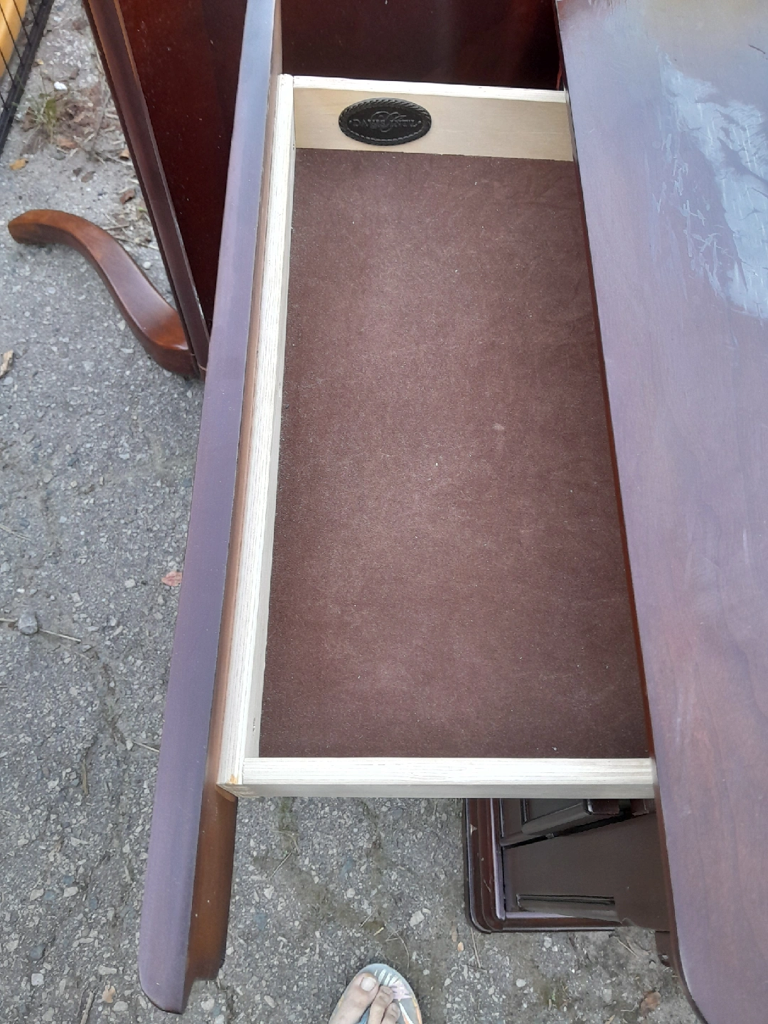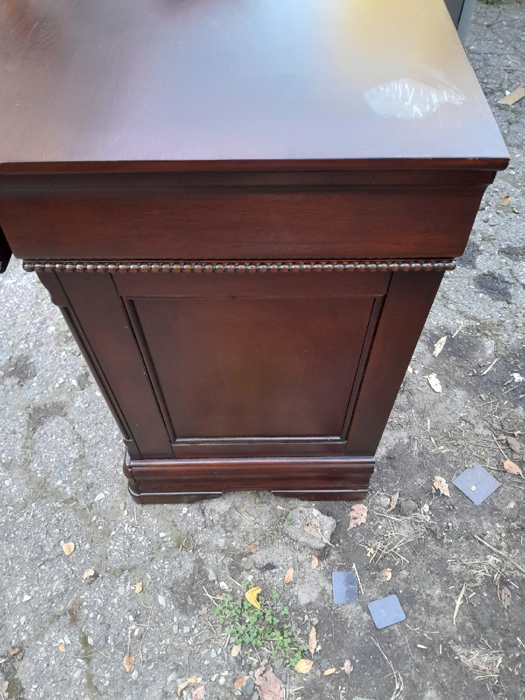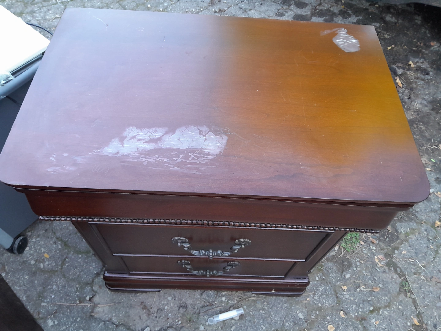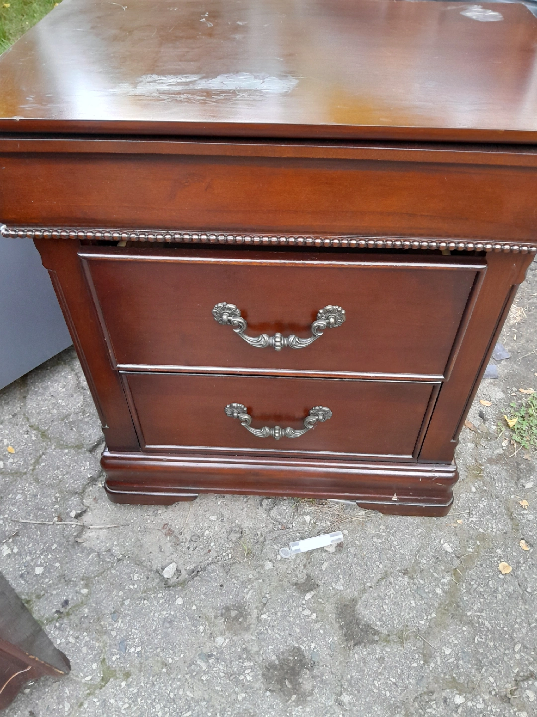 Selling a Davis Intl. 2-drawer nightstand. It's a lovely piece with a classic design. The drawers are lined with a soft, brown material. It would be a great addition to any bedroom! there is water damage on top sadly but could be fixed or cover with a pretty lace cover.