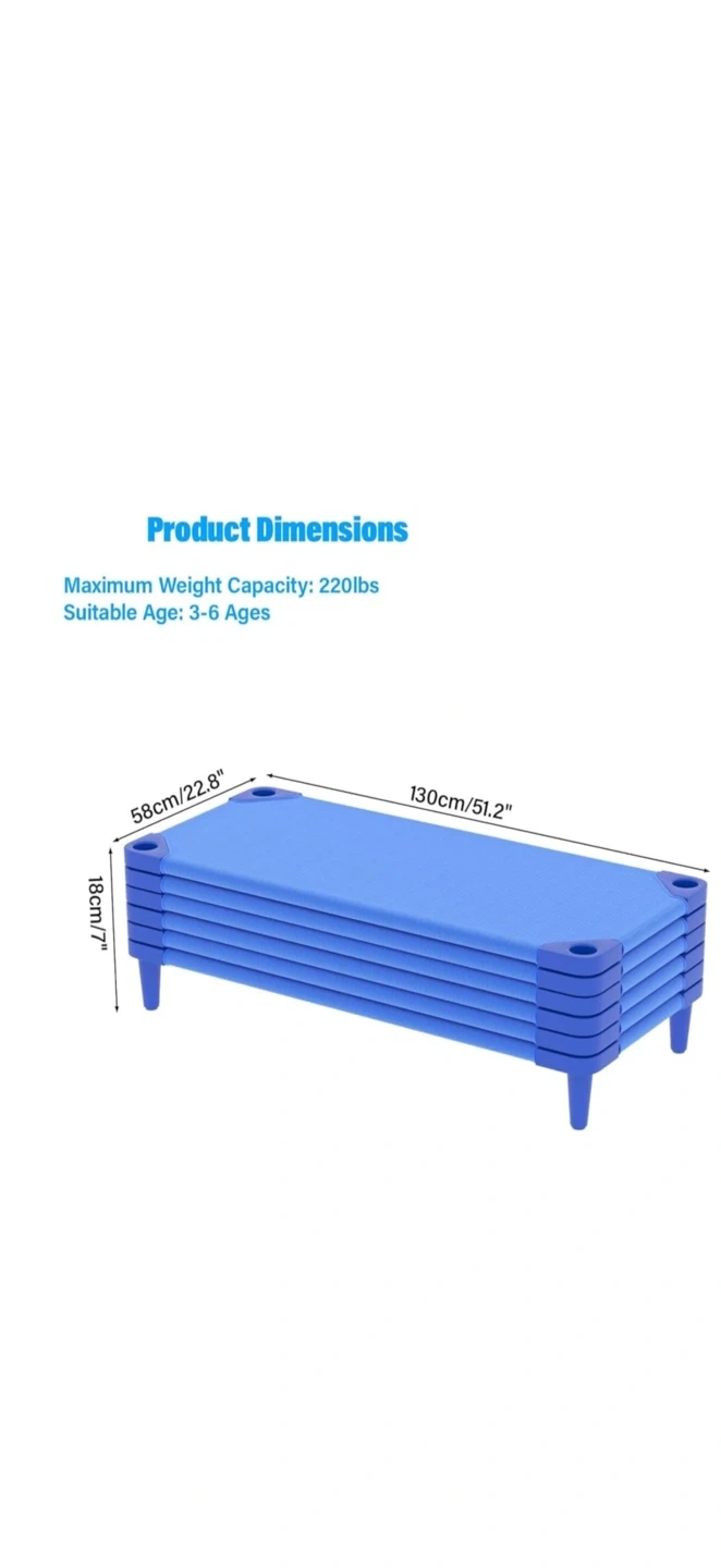 Selling a set of 6 ASDJAKZP daycare cots! They're stackable and perfect for kids. - Breathable mesh fabric - Portable toddler nap cots - Suitable for ages 3-6 - Each cot measures 51"x23" - Originally bought for $169.99