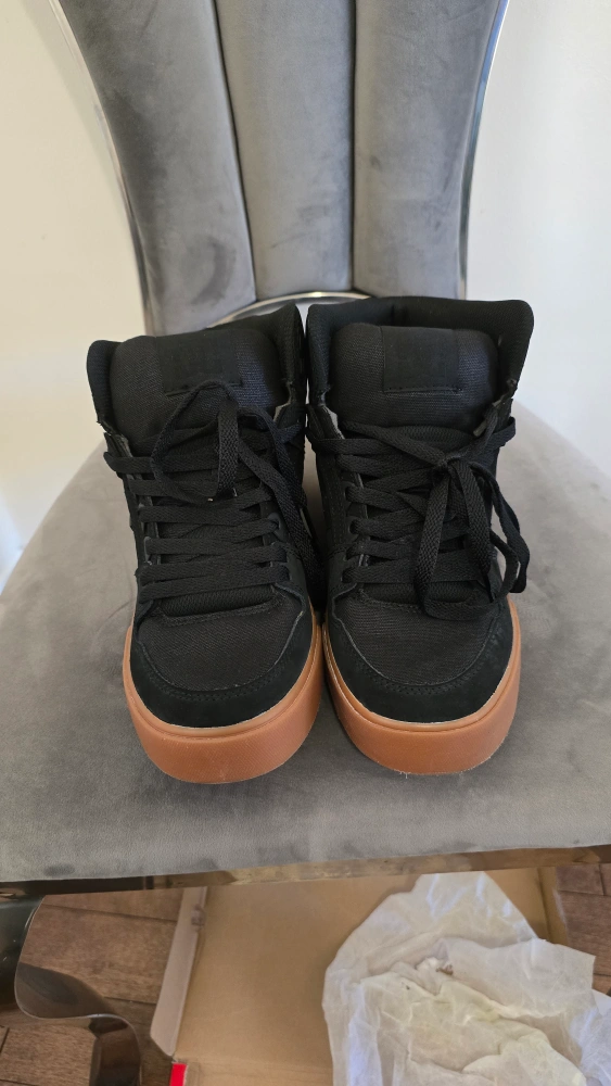 Selling a pair of DC high-top sneakers in black! They have a gum sole and are in great condition. The original box is included too